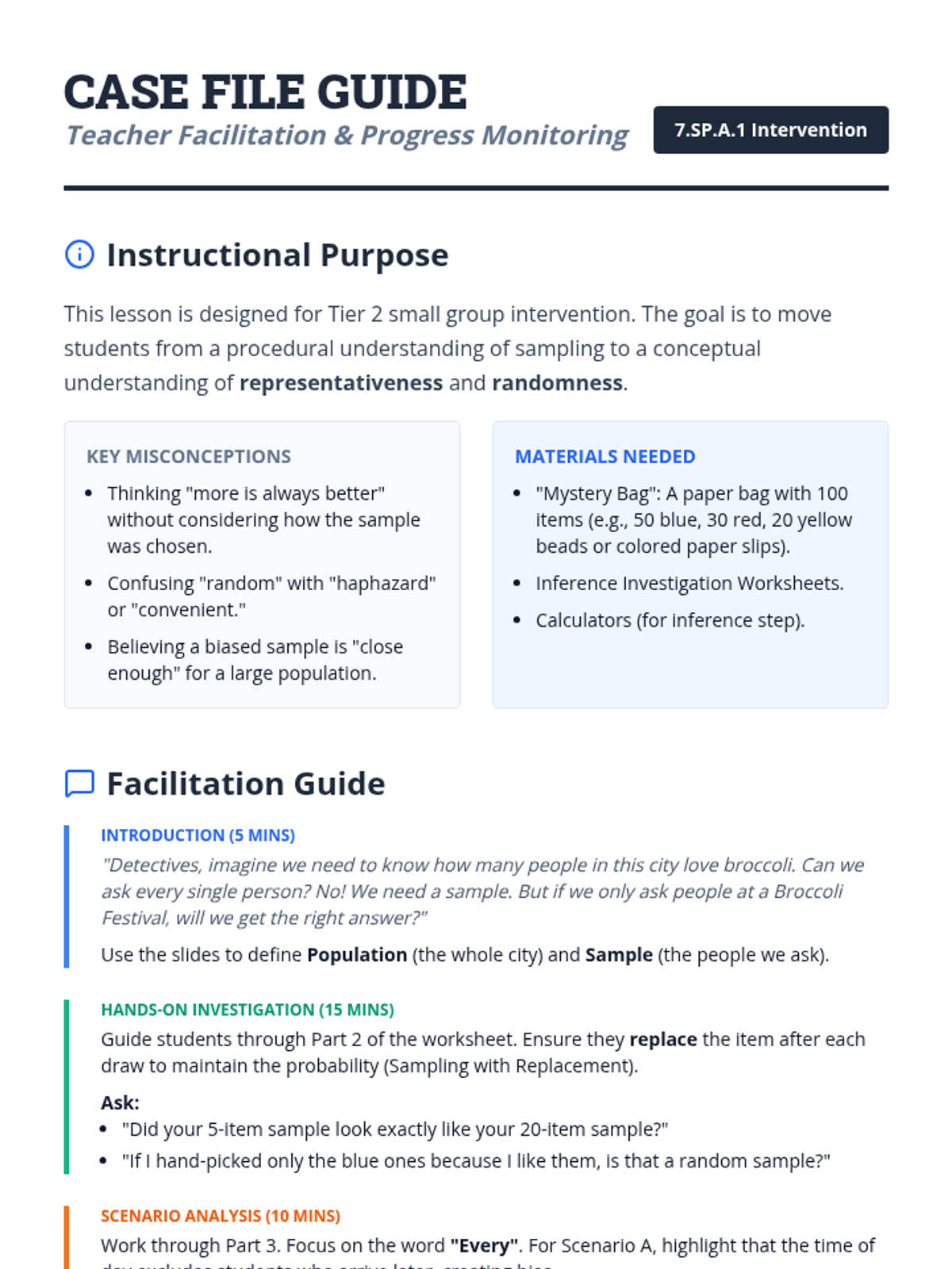 A Tier 2 intervention lesson designed for small groups to master the concepts of representative sampling and valid generalizations through scaffolded real-world scenarios and hands-on simulation.