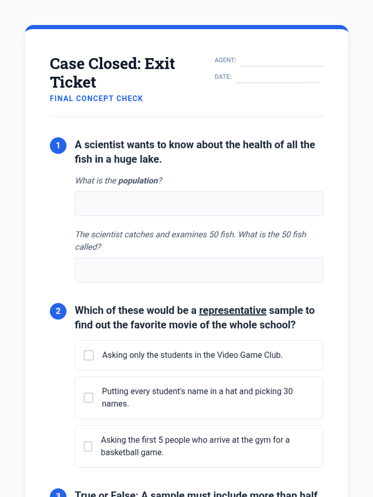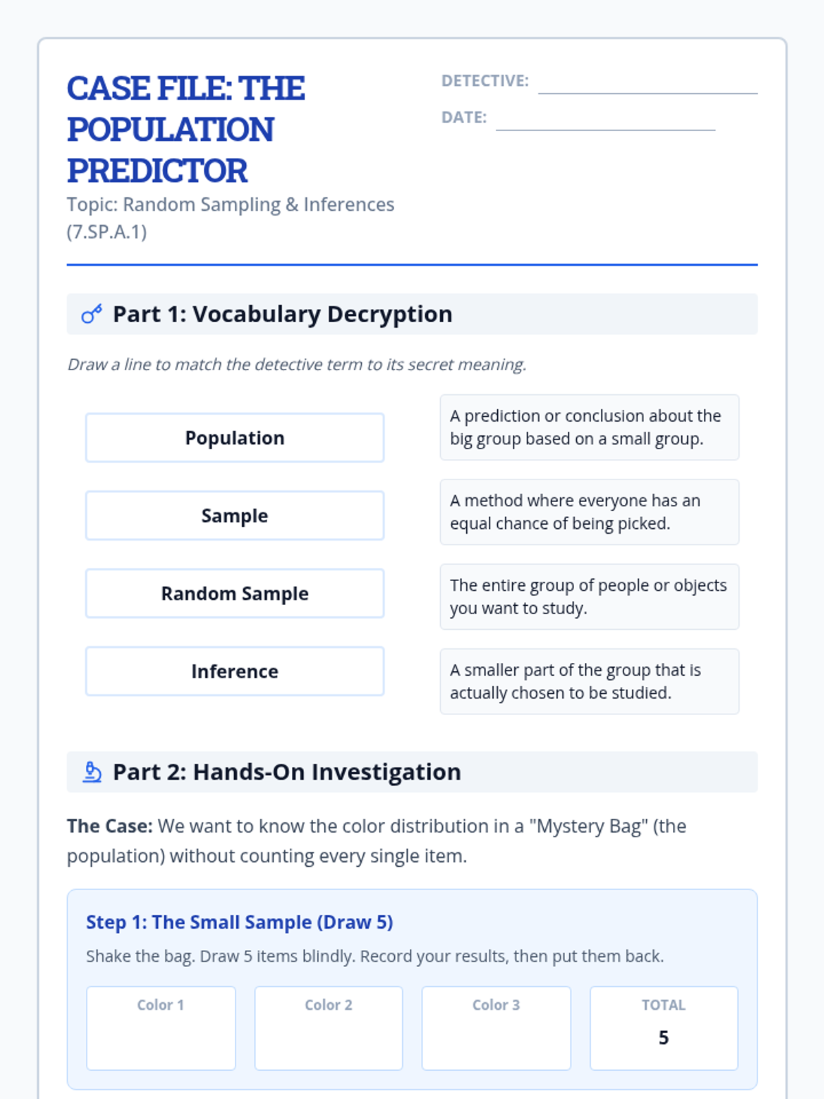 A Tier 2 small group intervention lesson focusing on the foundations of random sampling, representative samples, and making valid inferences about a population. Students act as 'Data Detectives' to investigate how different sampling methods affect the reliability of their conclusions.