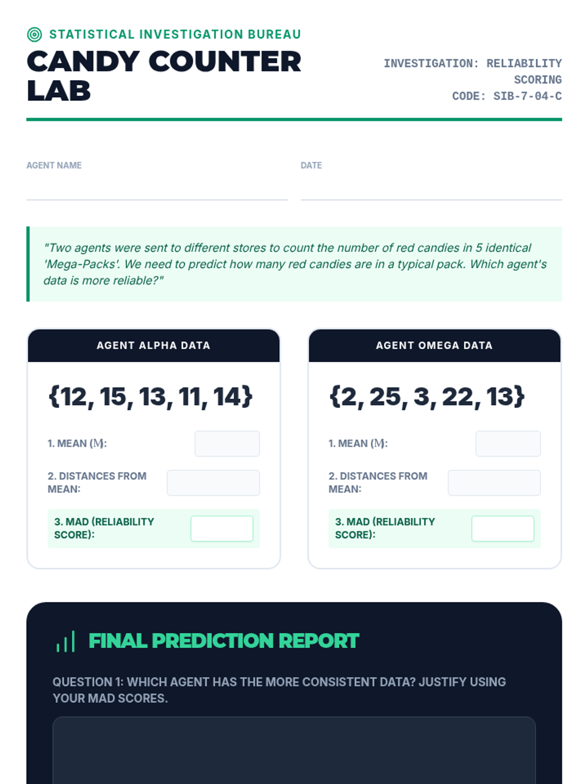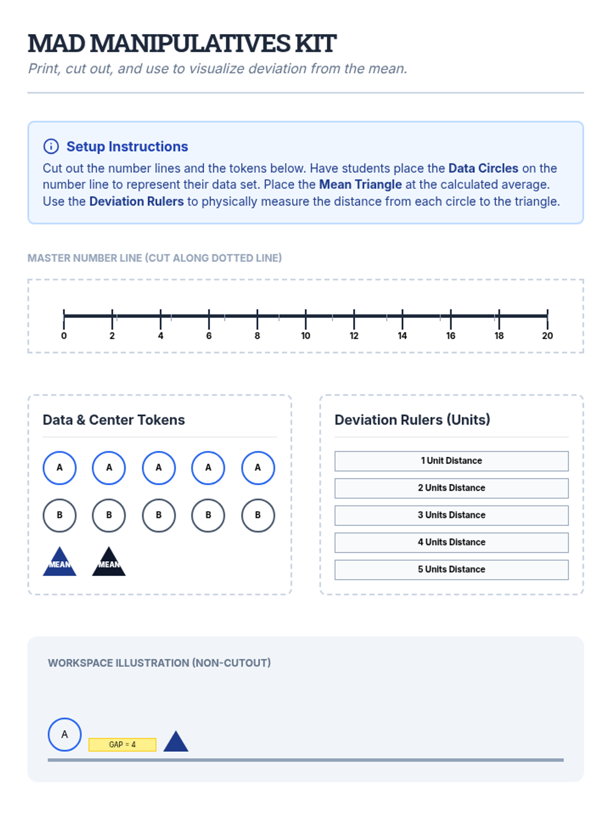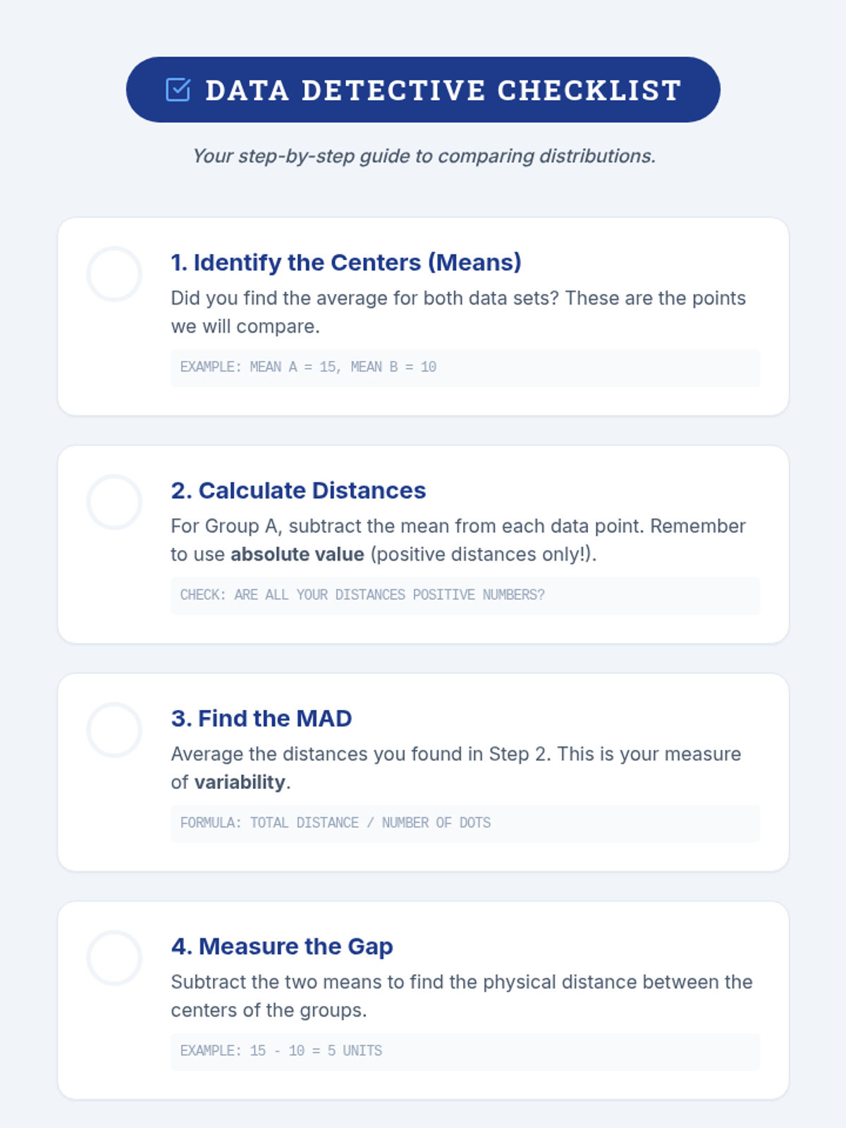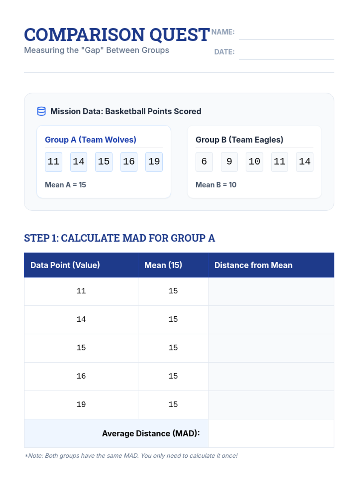 Students master the three-step algorithm for calculating Mean Absolute Deviation (MAD) using structured templates to organize their statistical work.