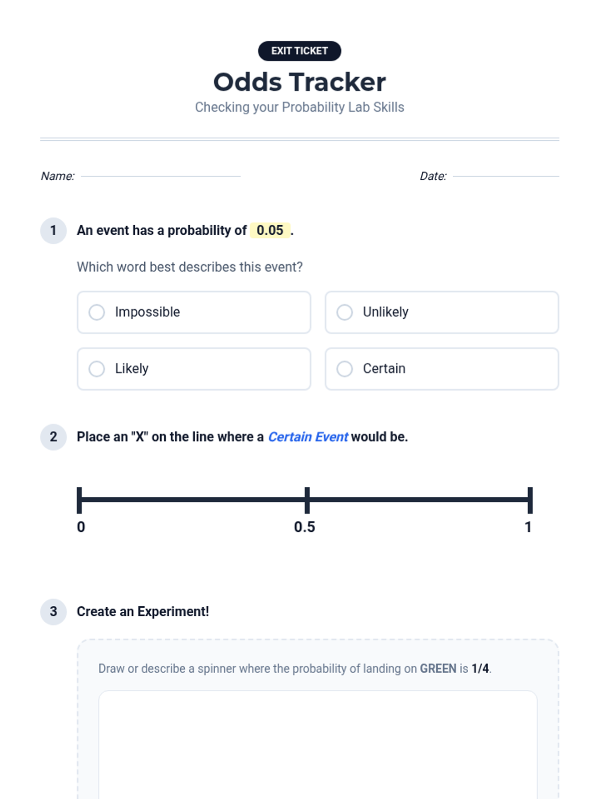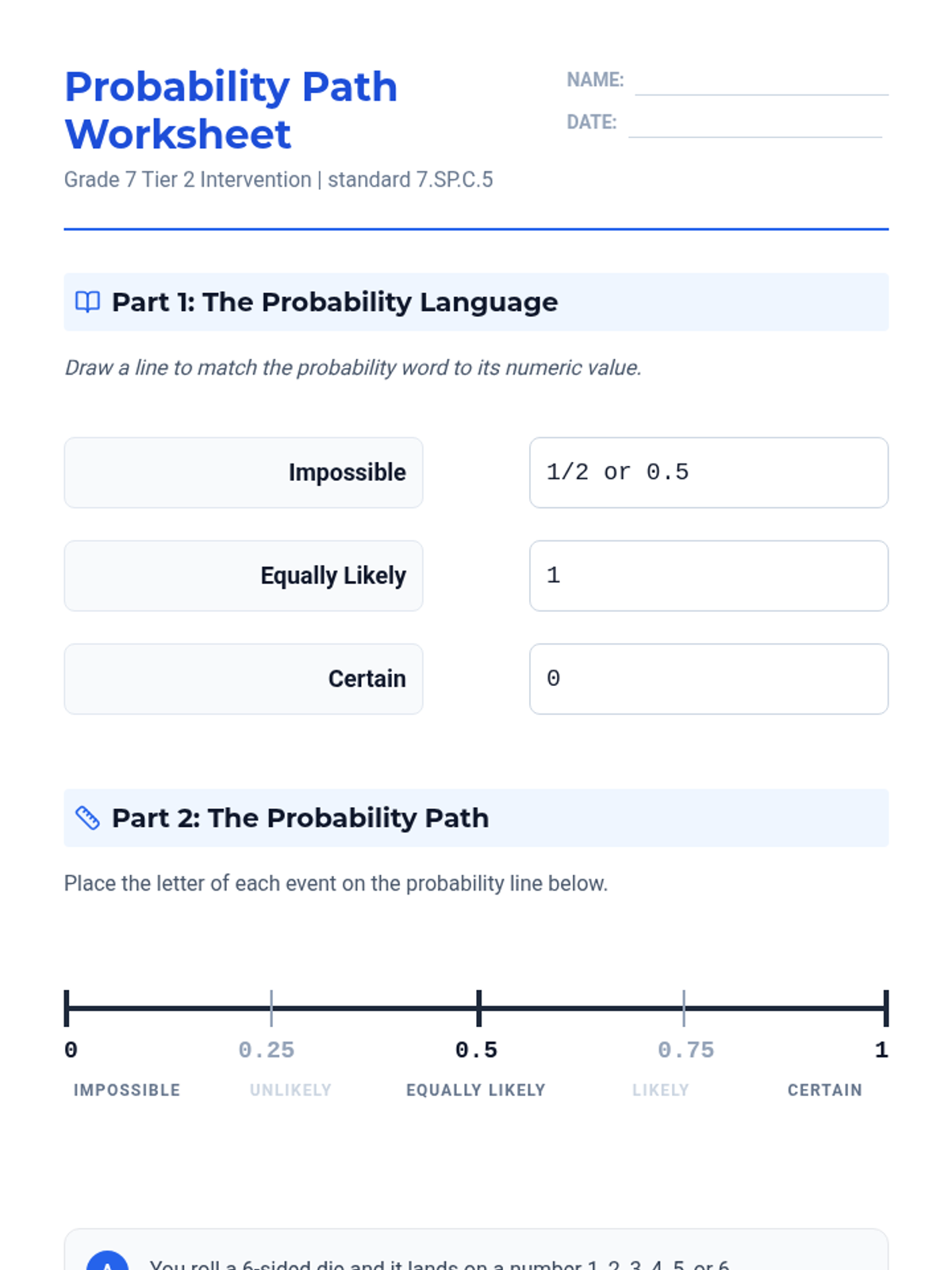 A Tier 2 intervention lesson focusing on the 0-1 probability scale, vocabulary of likelihood, and placing events on a number line. Students use hands-on experiments with dice and spinners to bridge conceptual gaps.