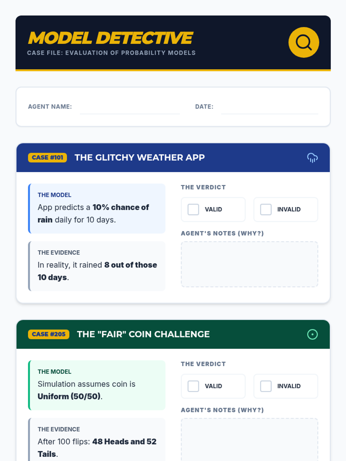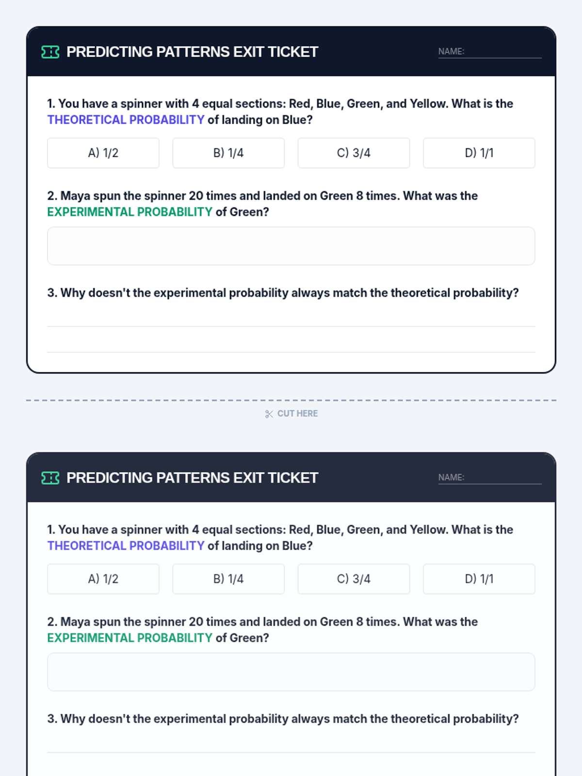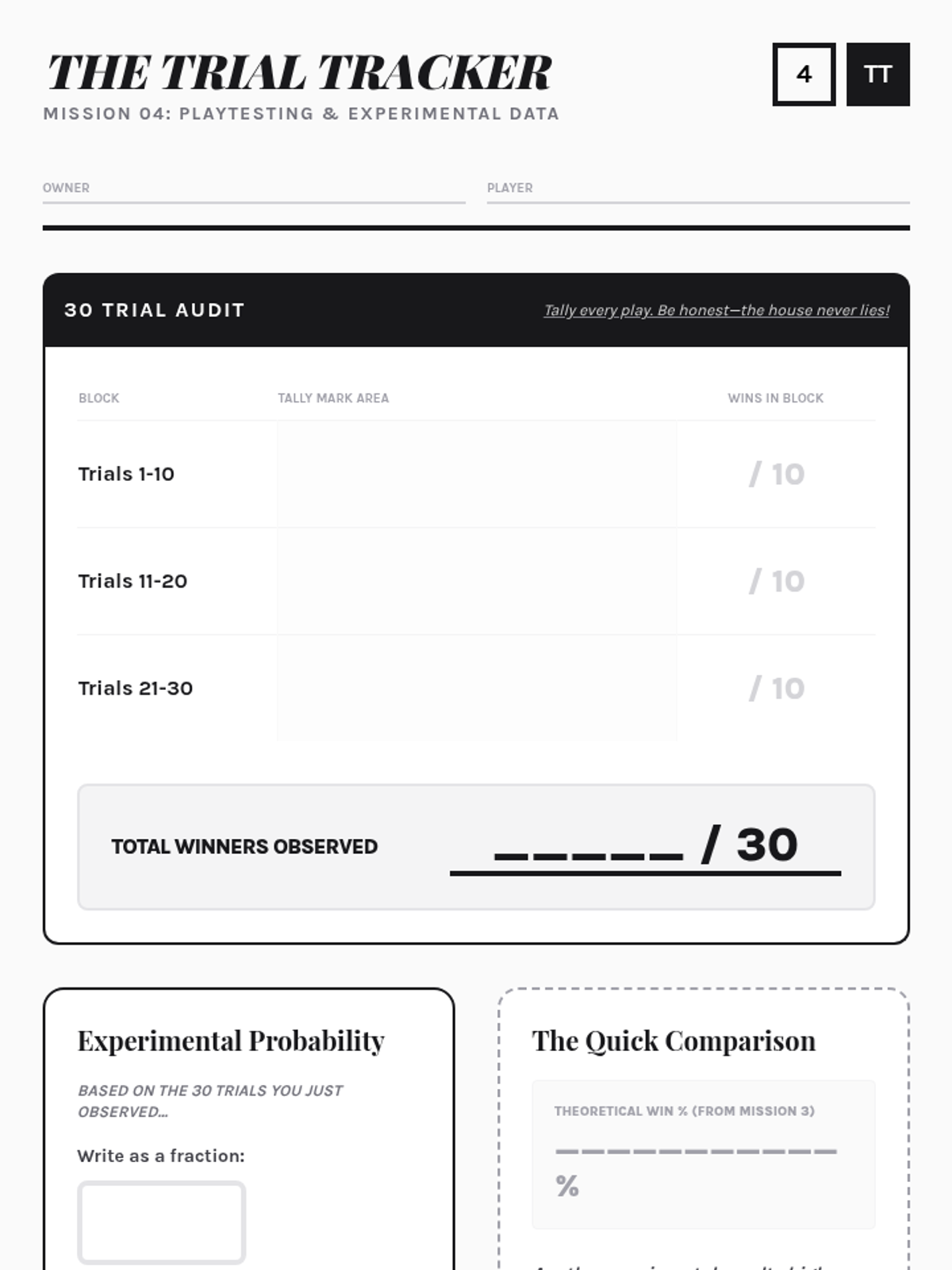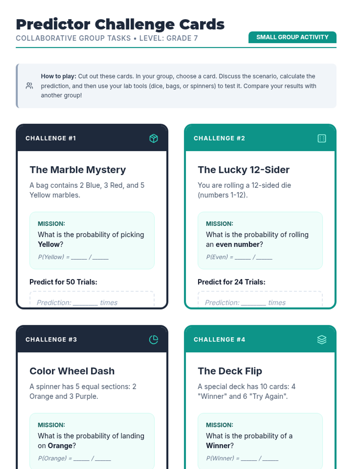 Through play-testing and data collection, students generate experimental probability to compare against their theoretical models.