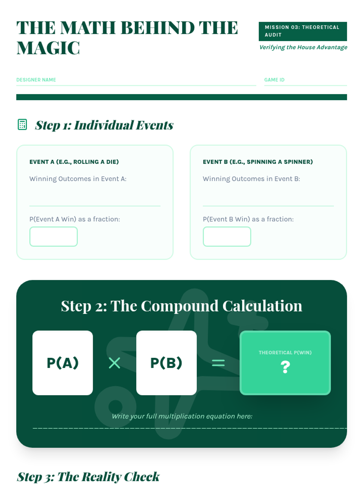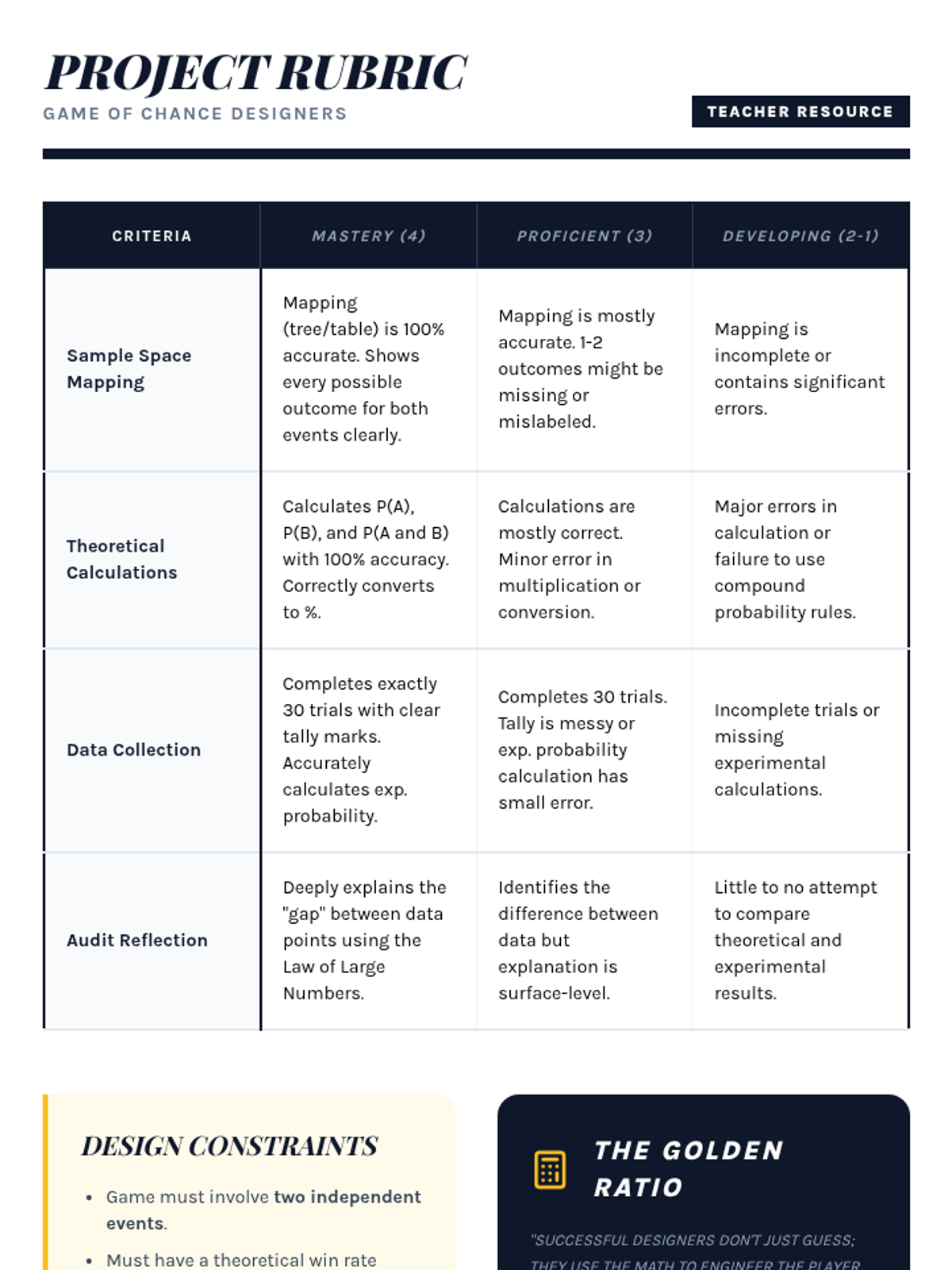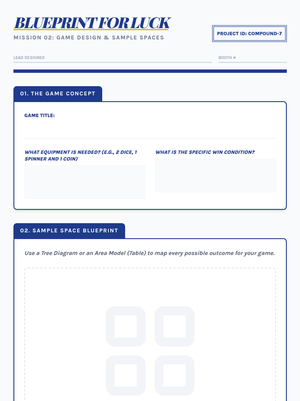 Students blueprint their own original games, focusing on creating compound mechanics and mapping out the resulting sample spaces.