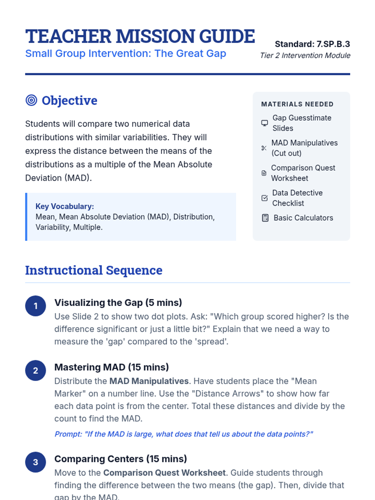 A Tier 2 intervention lesson for 7th grade students focusing on comparing data distributions. Students learn to calculate Mean Absolute Deviation (MAD) and express the difference between centers as a multiple of that variability.