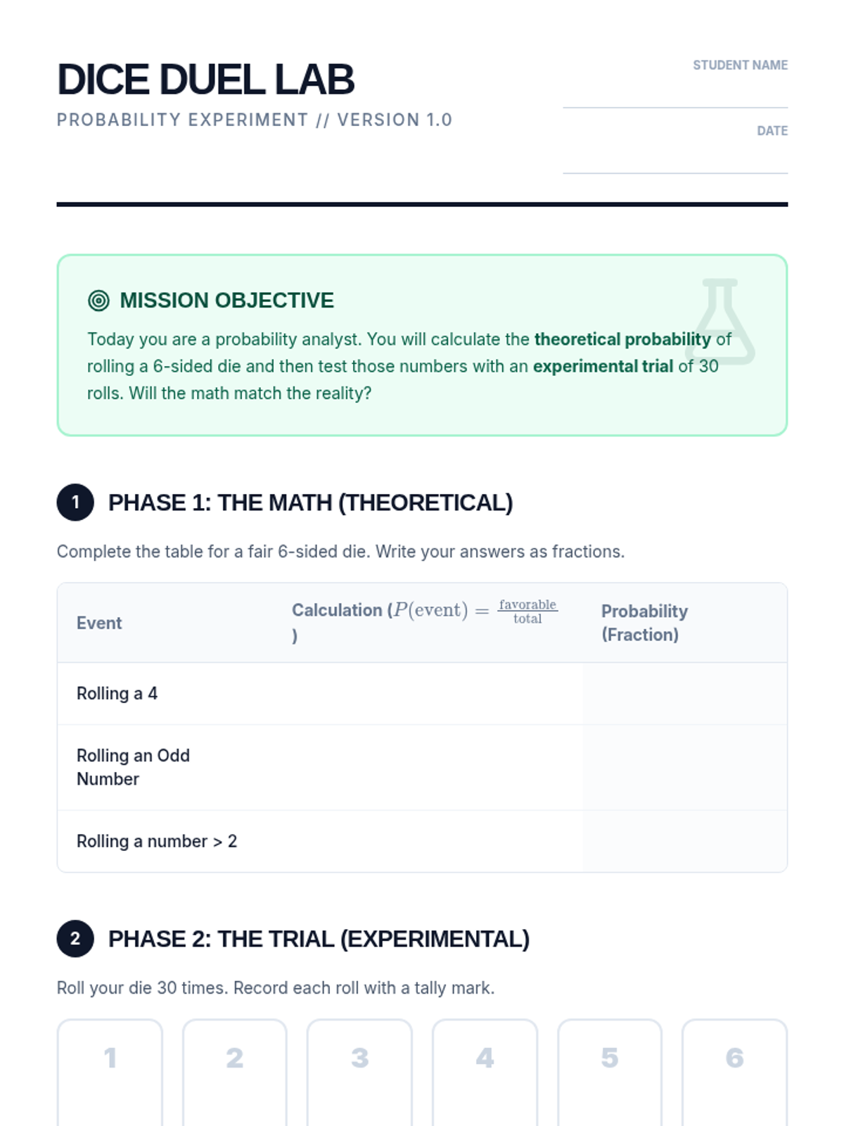 Students compare theoretical and experimental probability by rolling dice and analyzing why real-world results differ from mathematical predictions.