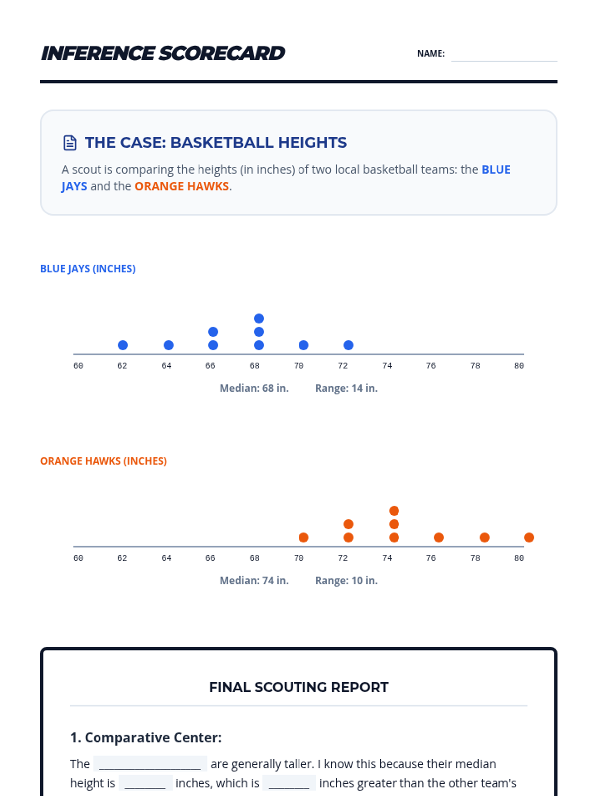 In the final lesson, students compare two distinct populations using mean and MAD to determine if differences between groups are significant relative to their variability.