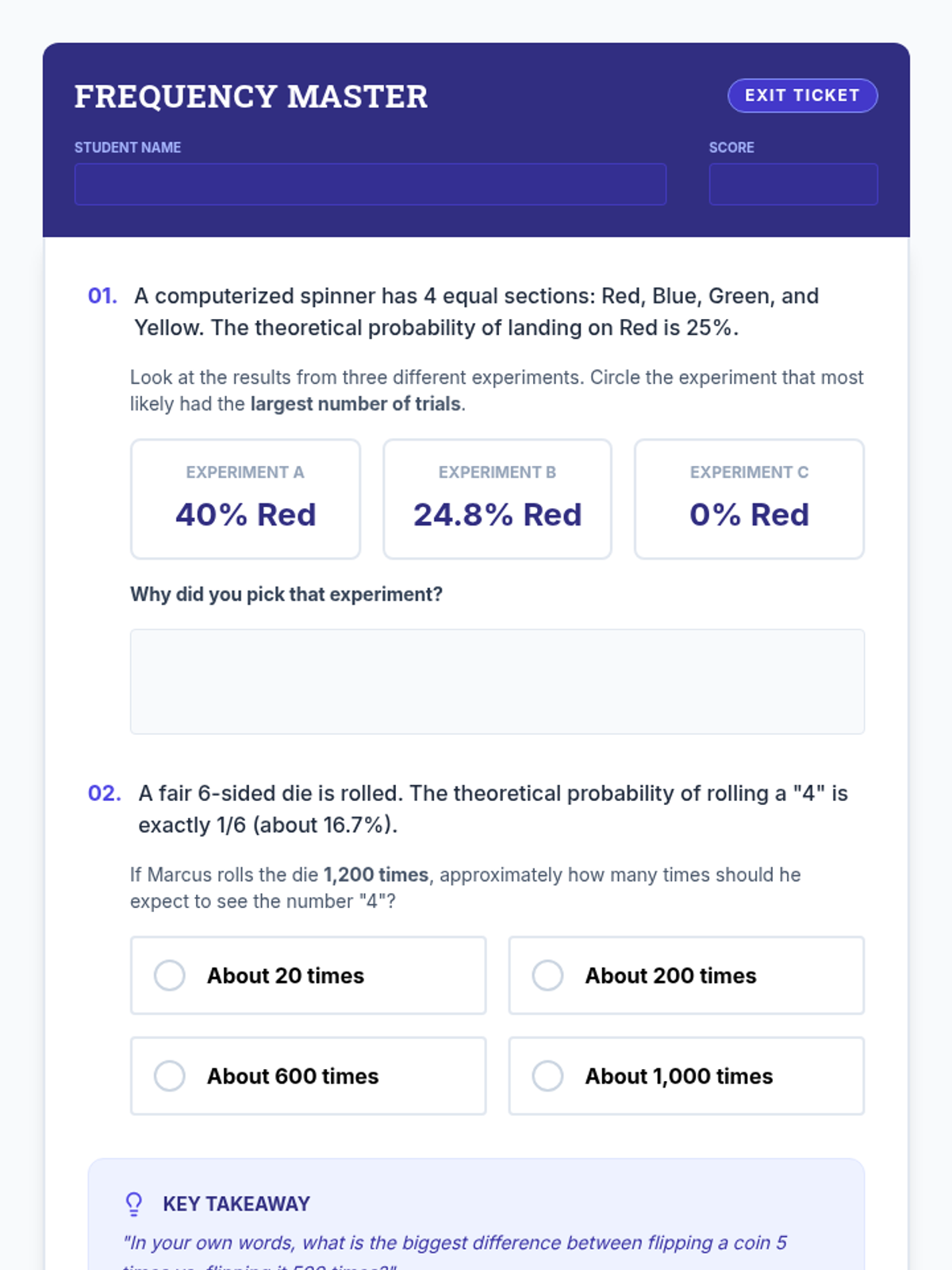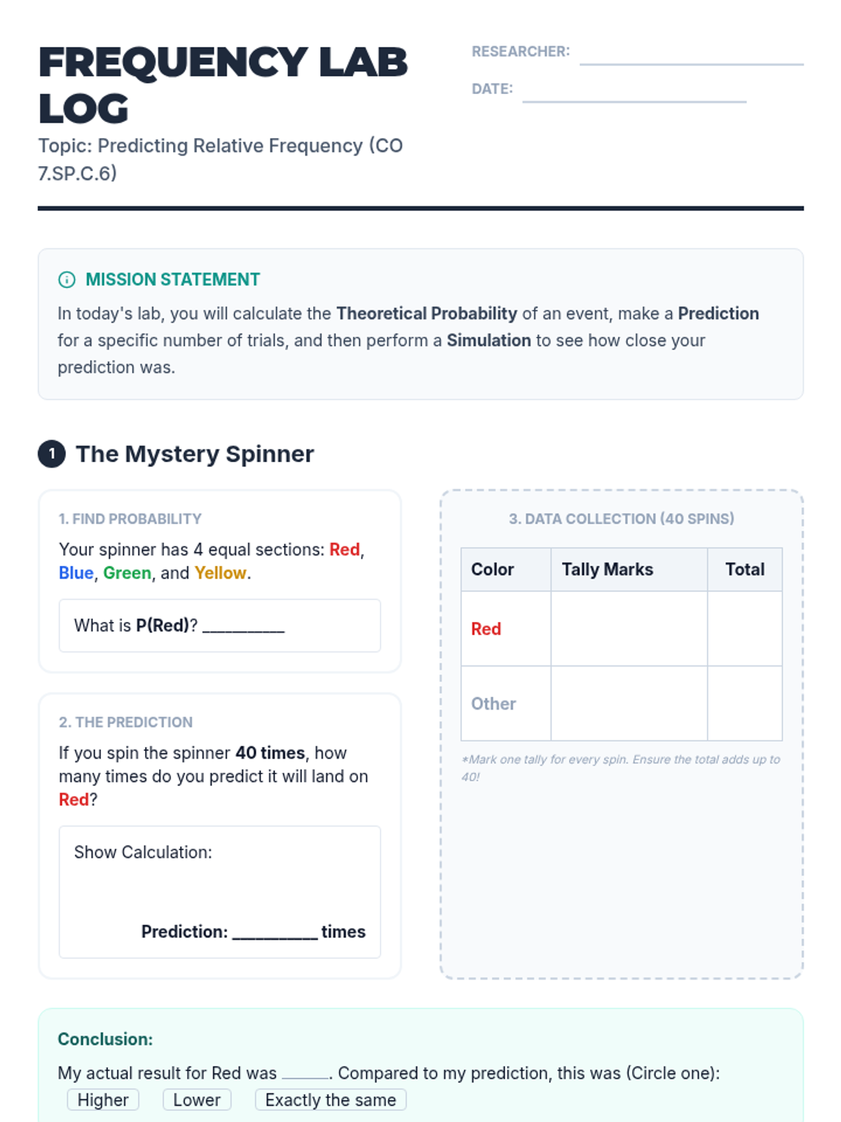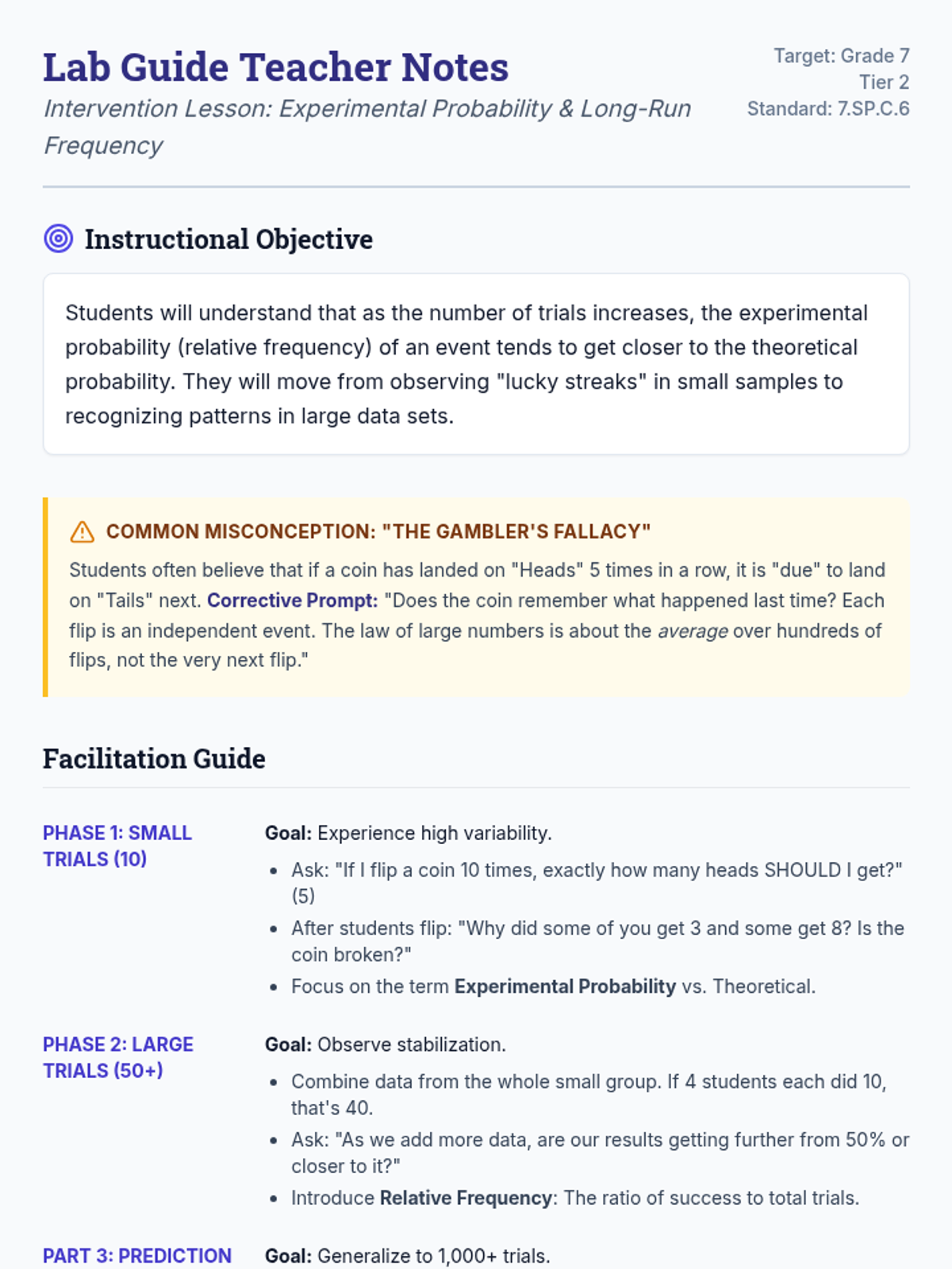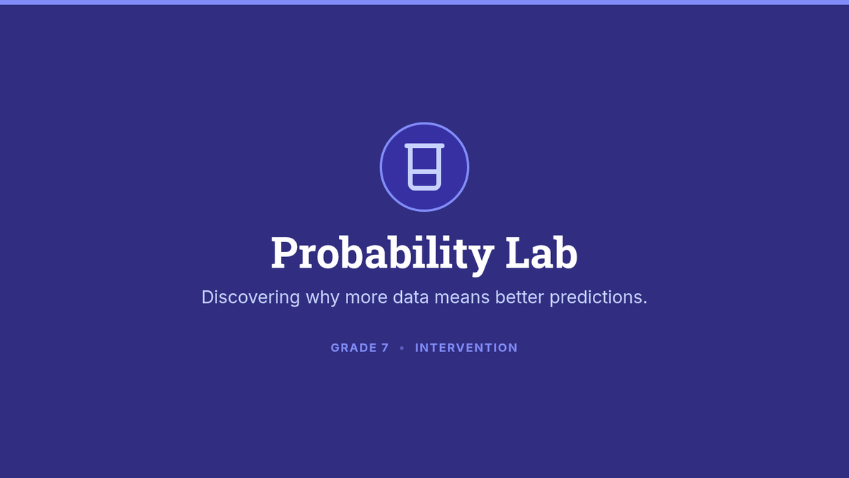 A targeted Tier 2 intervention lesson focusing on experimental probability and the law of large numbers through hands-on data collection and analysis. Students compare small-sample results with long-run relative frequencies to bridge the gap between experimental and theoretical outcomes.