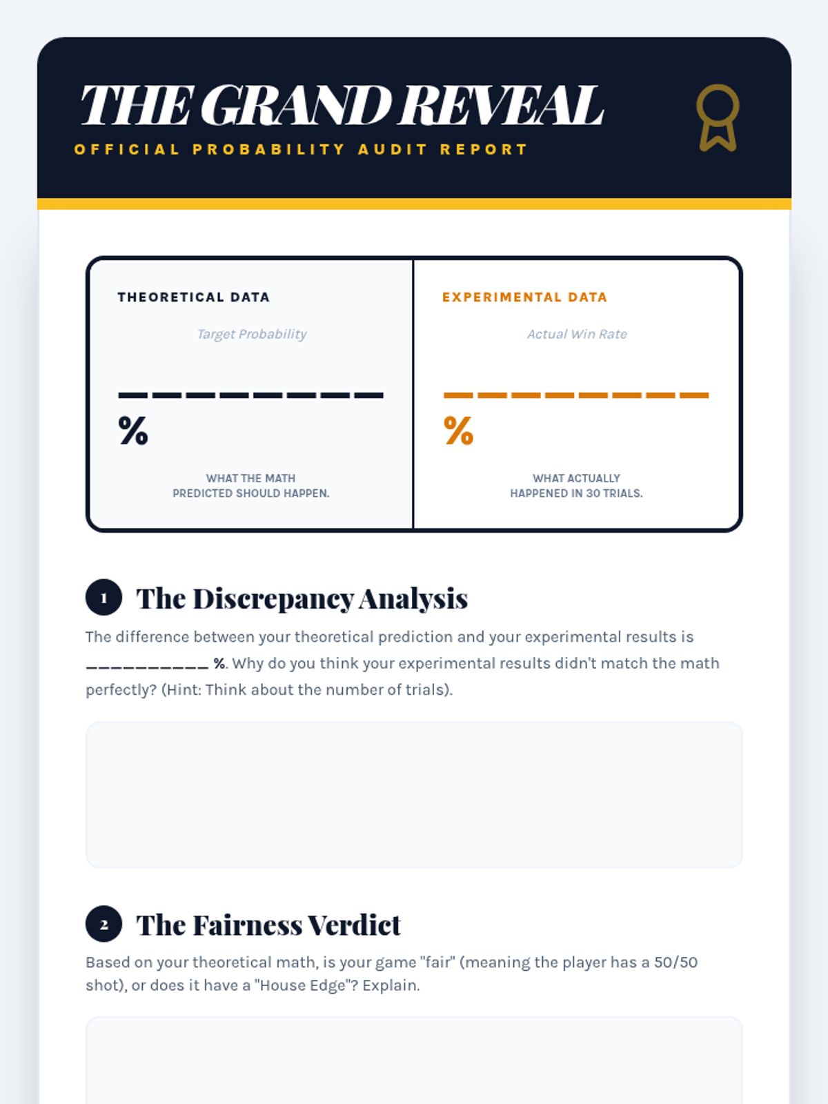 Students perform a final 'audit' of their game, presenting their findings on theoretical vs. experimental probability to the class.