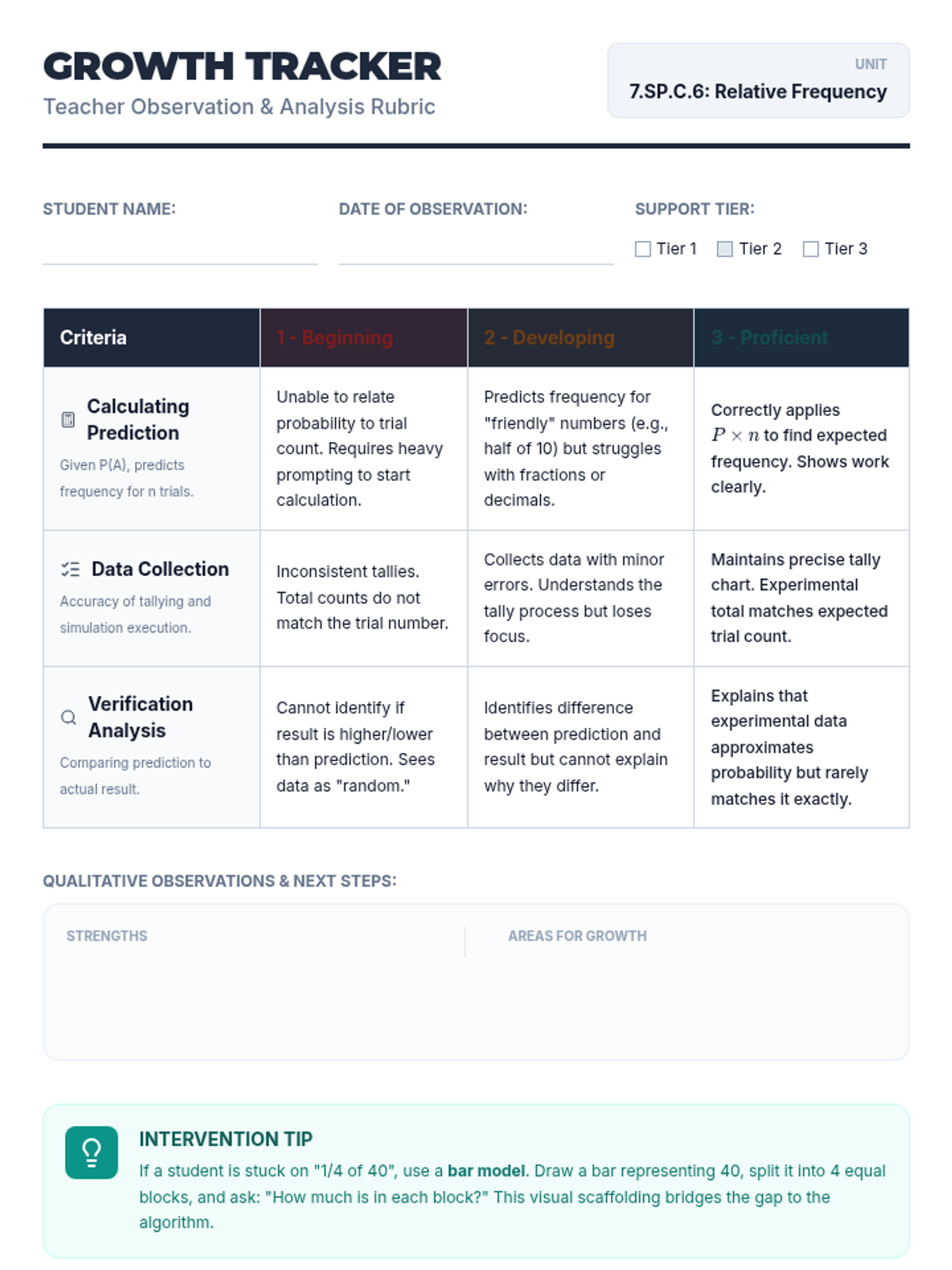 A Tier 2 intervention lesson for 7th grade students focusing on predicting relative frequency from probability and verifying with data collection. Students engage in hands-on simulations using tally charts and collaborative challenges.