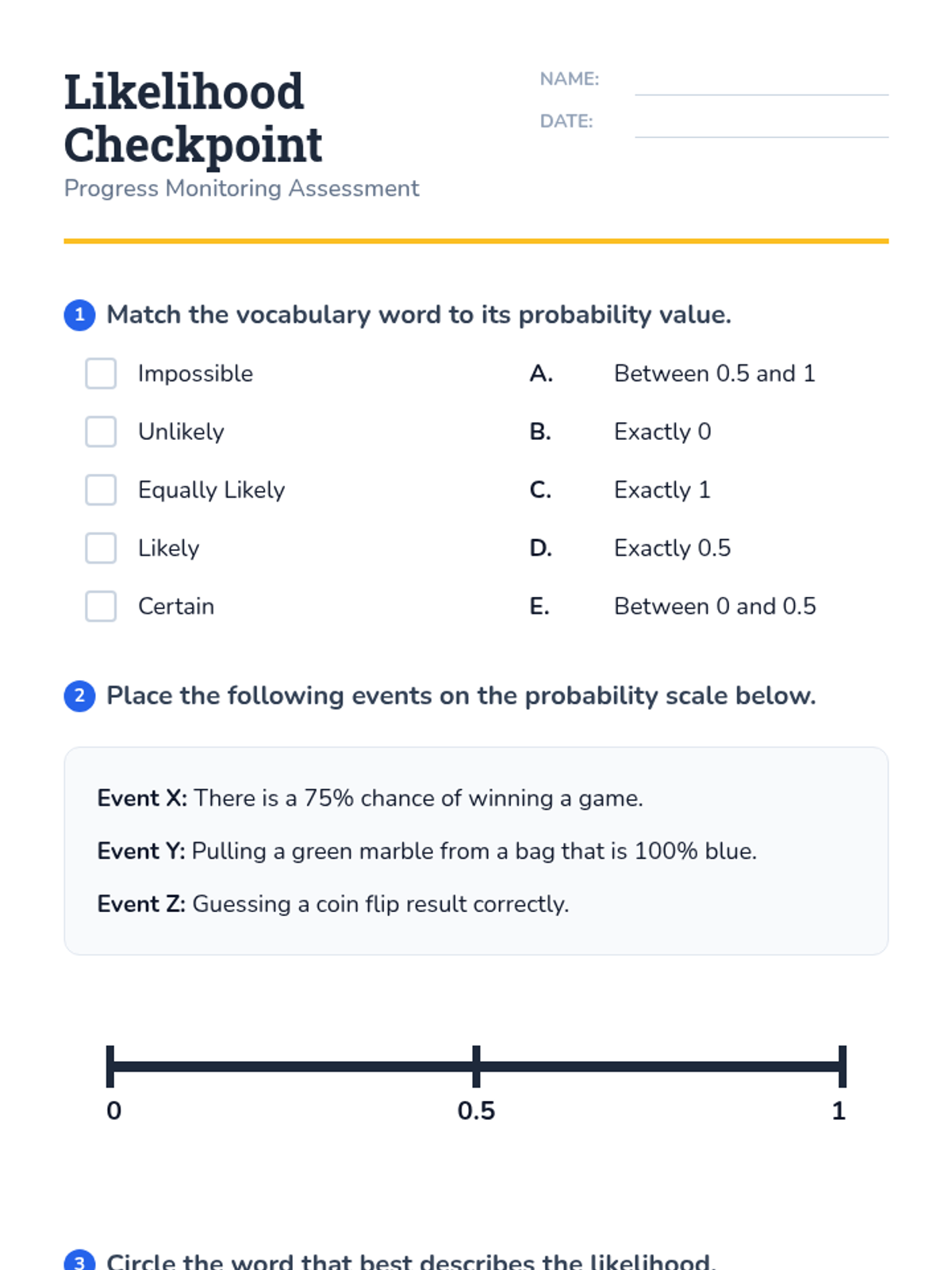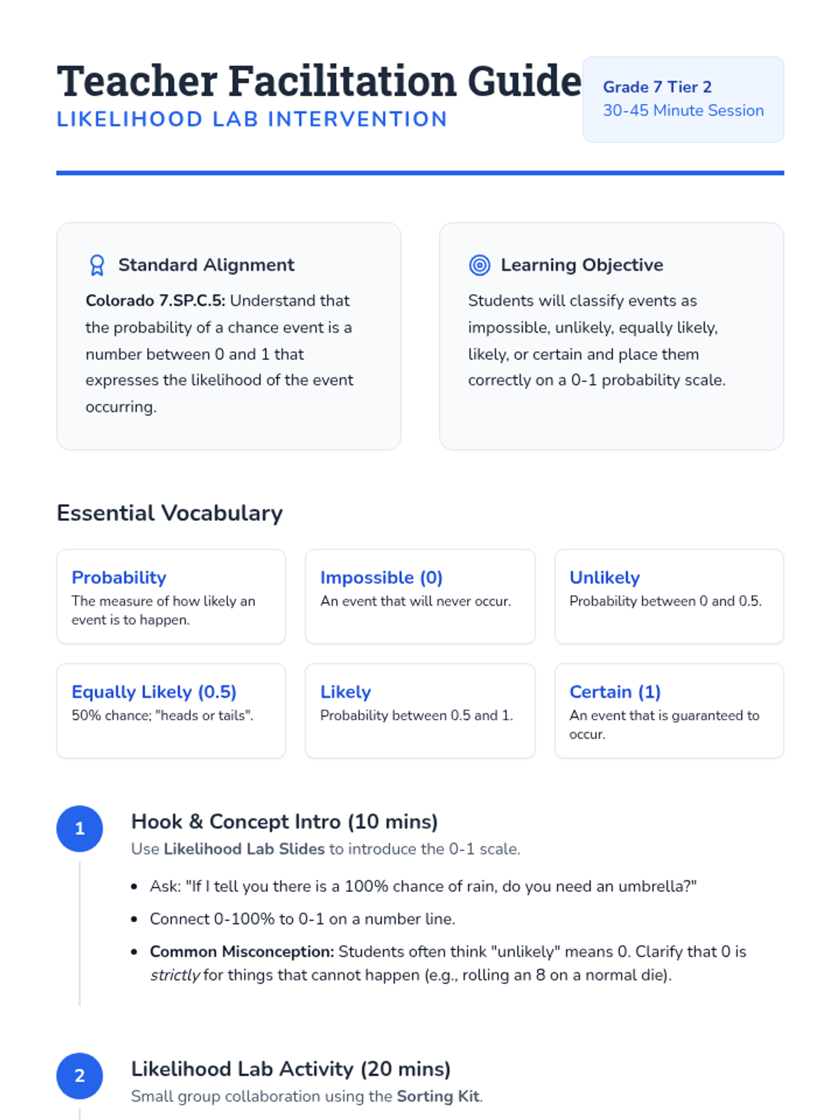 A Tier 2 intervention lesson for 7th grade students focusing on the probability scale (0-1) and classifying the likelihood of events using standard vocabulary. Includes hands-on sorting and progress monitoring.