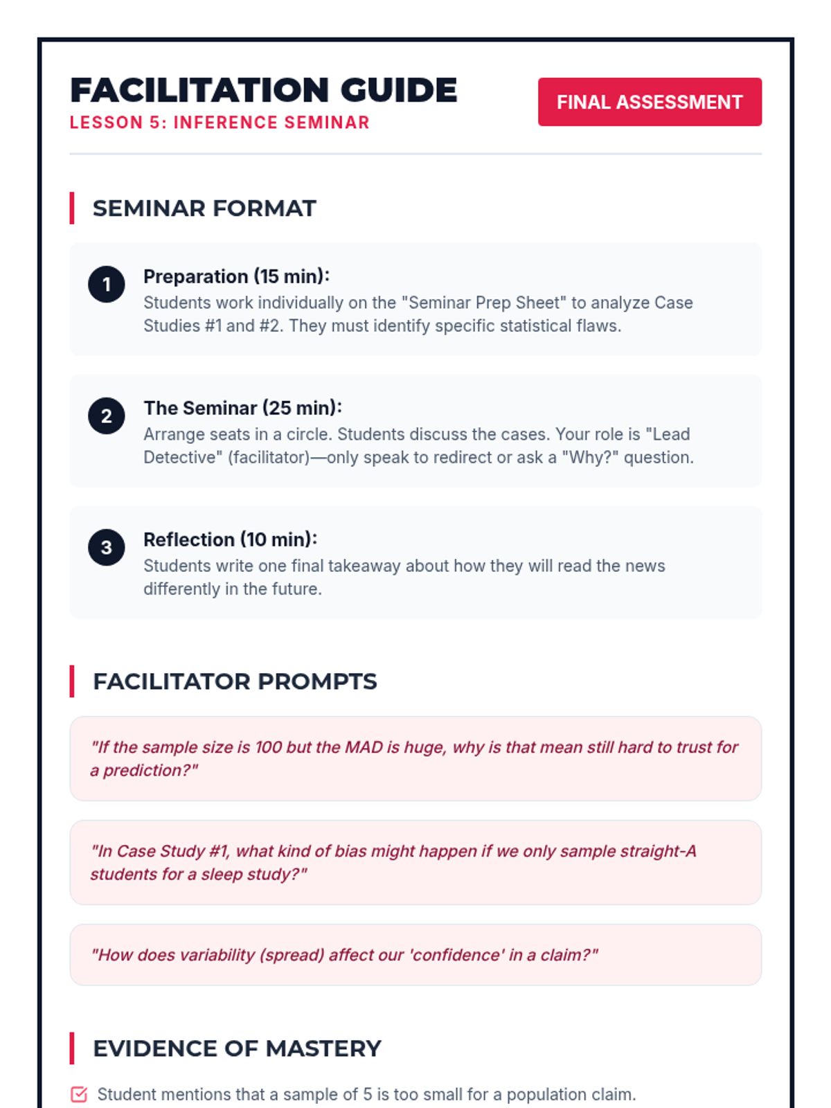 A Tier 2 intervention lesson focusing on the core logic of statistical inference. Students move from physical sampling to conceptual understanding of how samples represent populations.