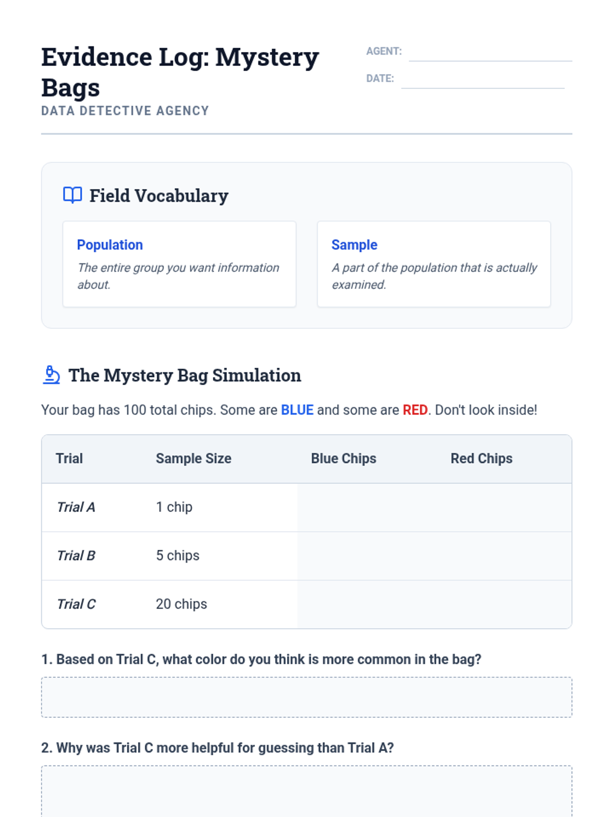Students are presented with various sampling scenarios and must decide if the sample size and method are sufficient to draw a valid conclusion. They practice using language that reflects statistical uncertainty (likely, probable, estimated).
