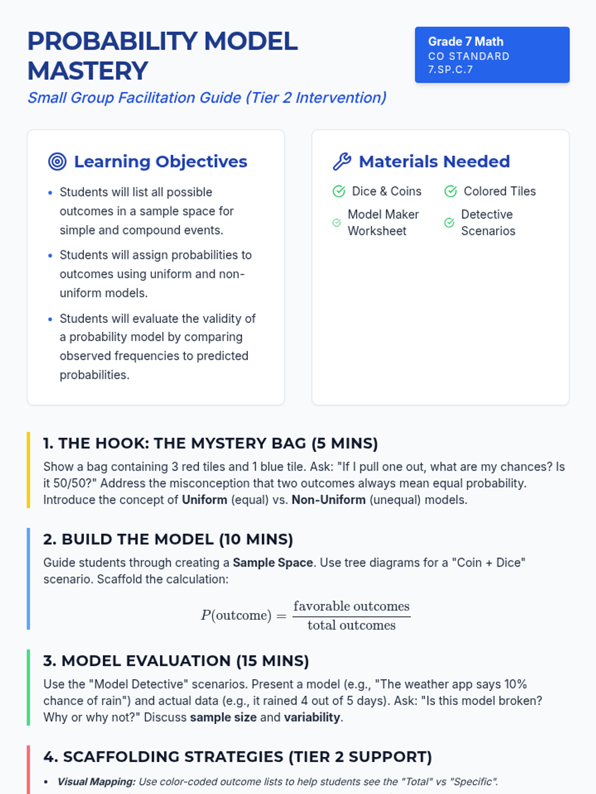 A Tier 2 intervention lesson for 7th grade students focusing on creating sample spaces, assigning probabilities to outcomes, and evaluating the validity of probability models using real-world data and theoretical predictions.