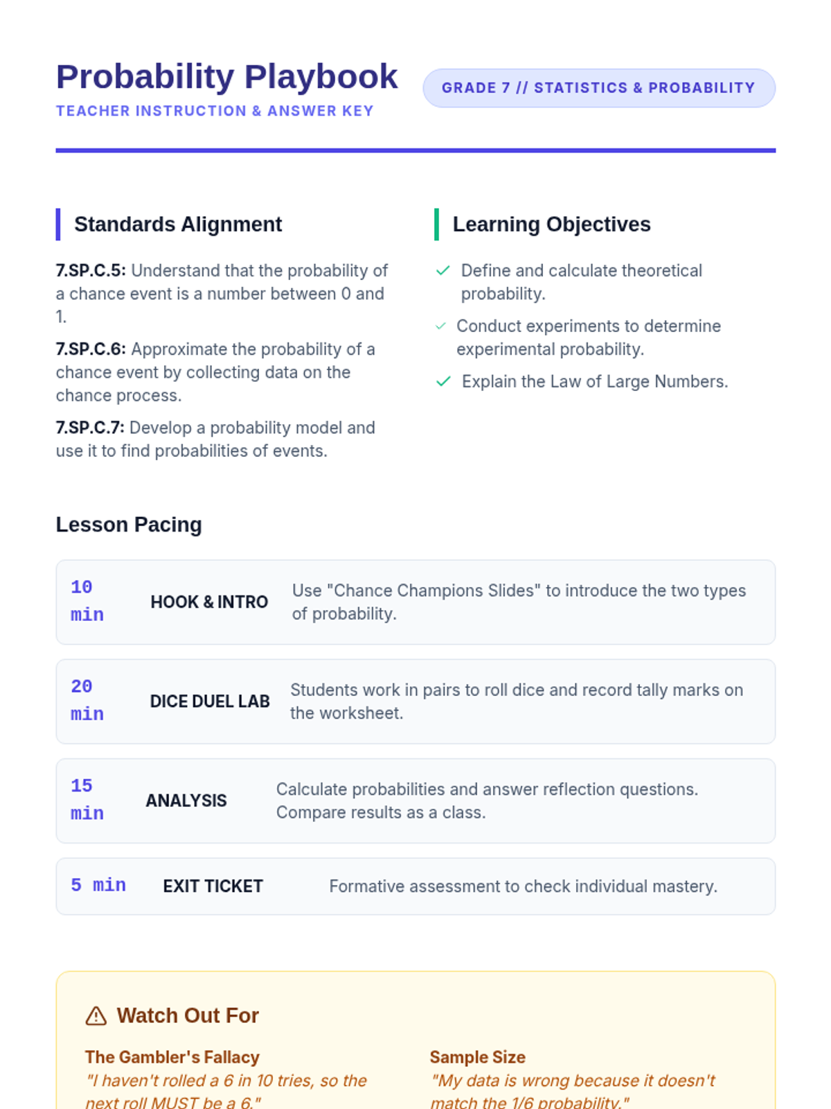 Students explore simple probability and sample space through a station-based lab, using dice, marbles, and spinners to calculate P(event) while addressing common misconceptions.