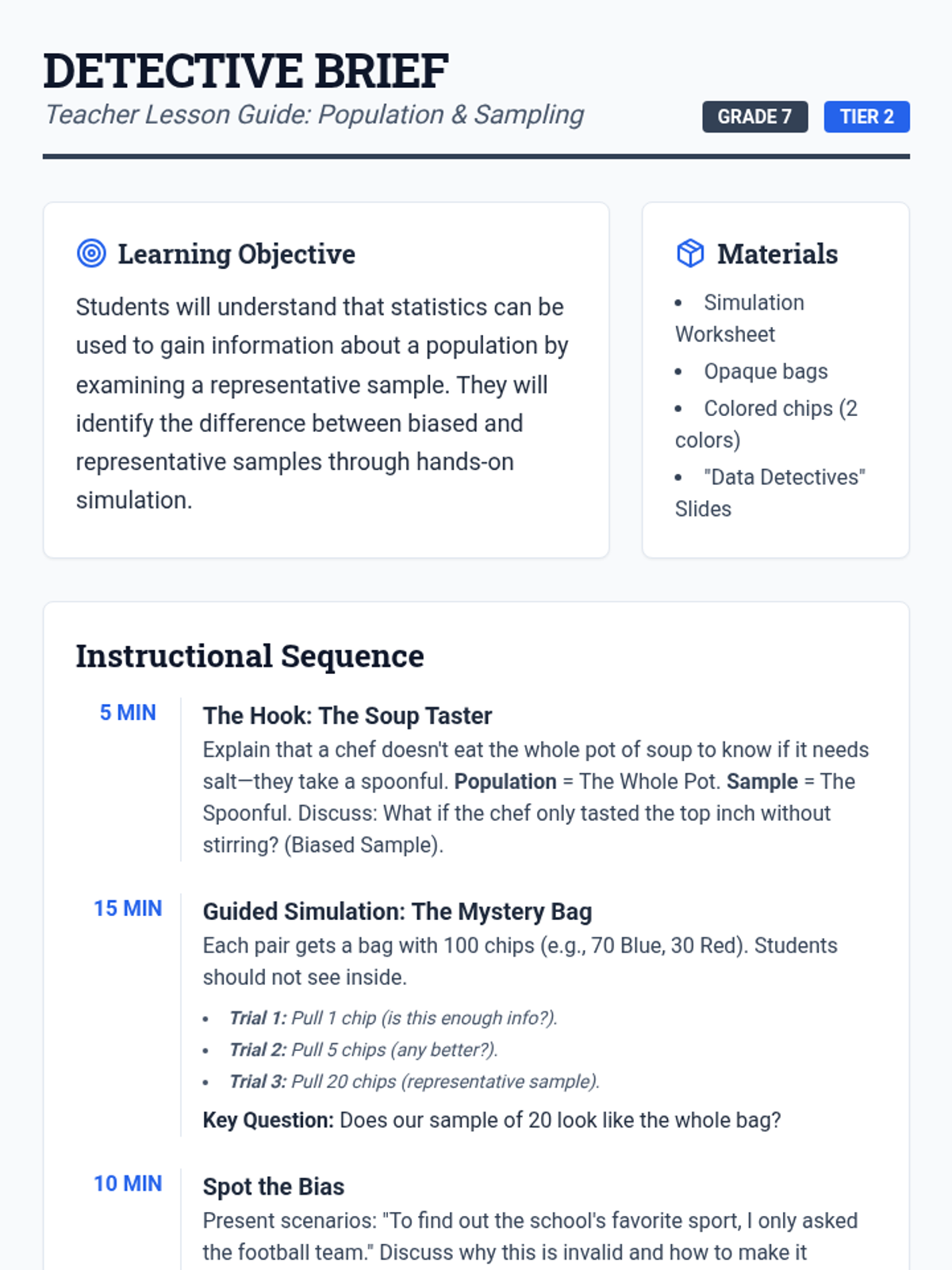 A Tier 2 intervention lesson for 7th grade students focusing on population sampling. Students use hands-on simulations with colored chips to understand how representative samples allow for valid inferences about a larger population.