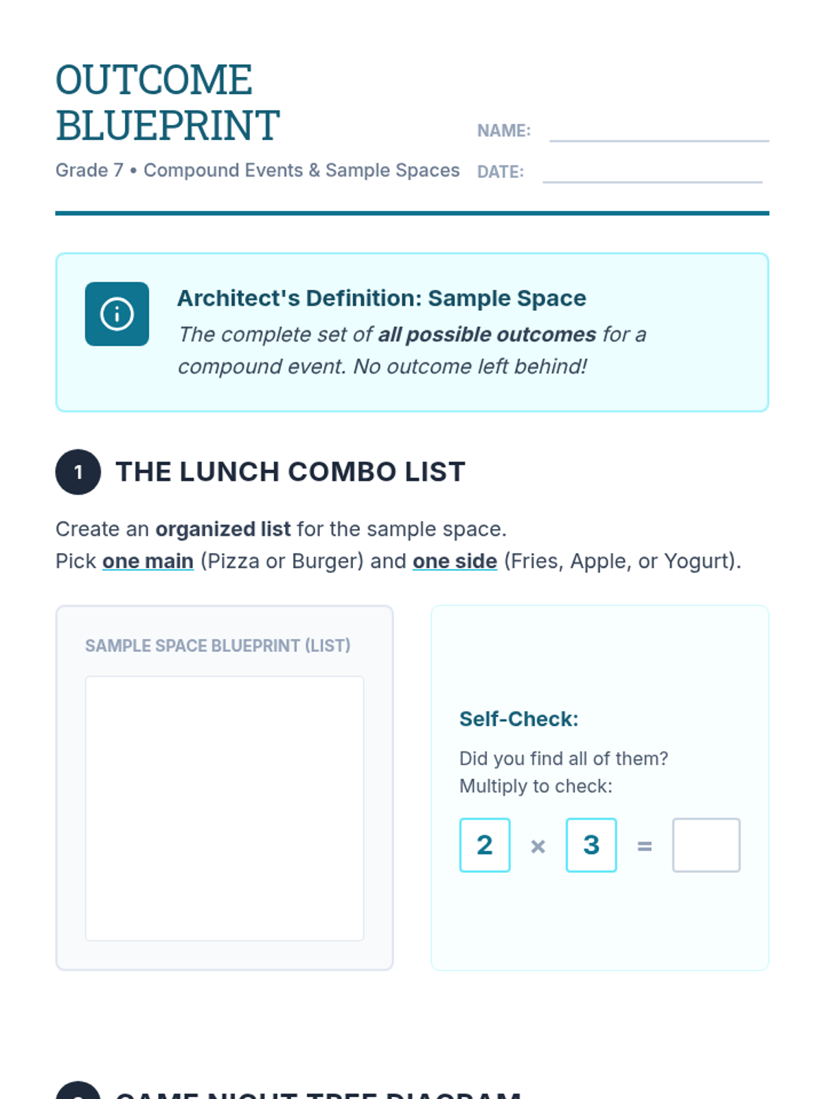 A targeted Tier 2 intervention lesson focusing on representing sample spaces for compound events using organized lists and tree diagrams. Students will build 'blueprints' of all possible outcomes for various multi-step scenarios.