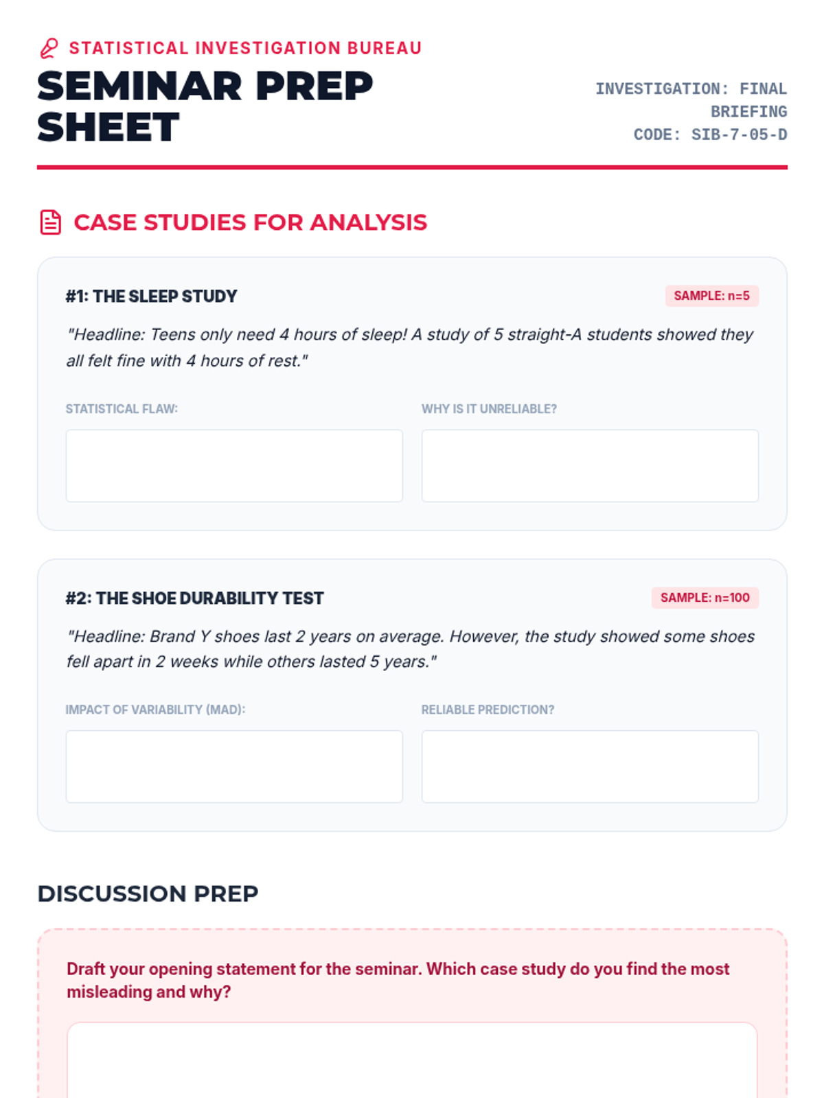 A Socratic seminar critiquing real-world media claims based on statistical principles of sample size and variability.