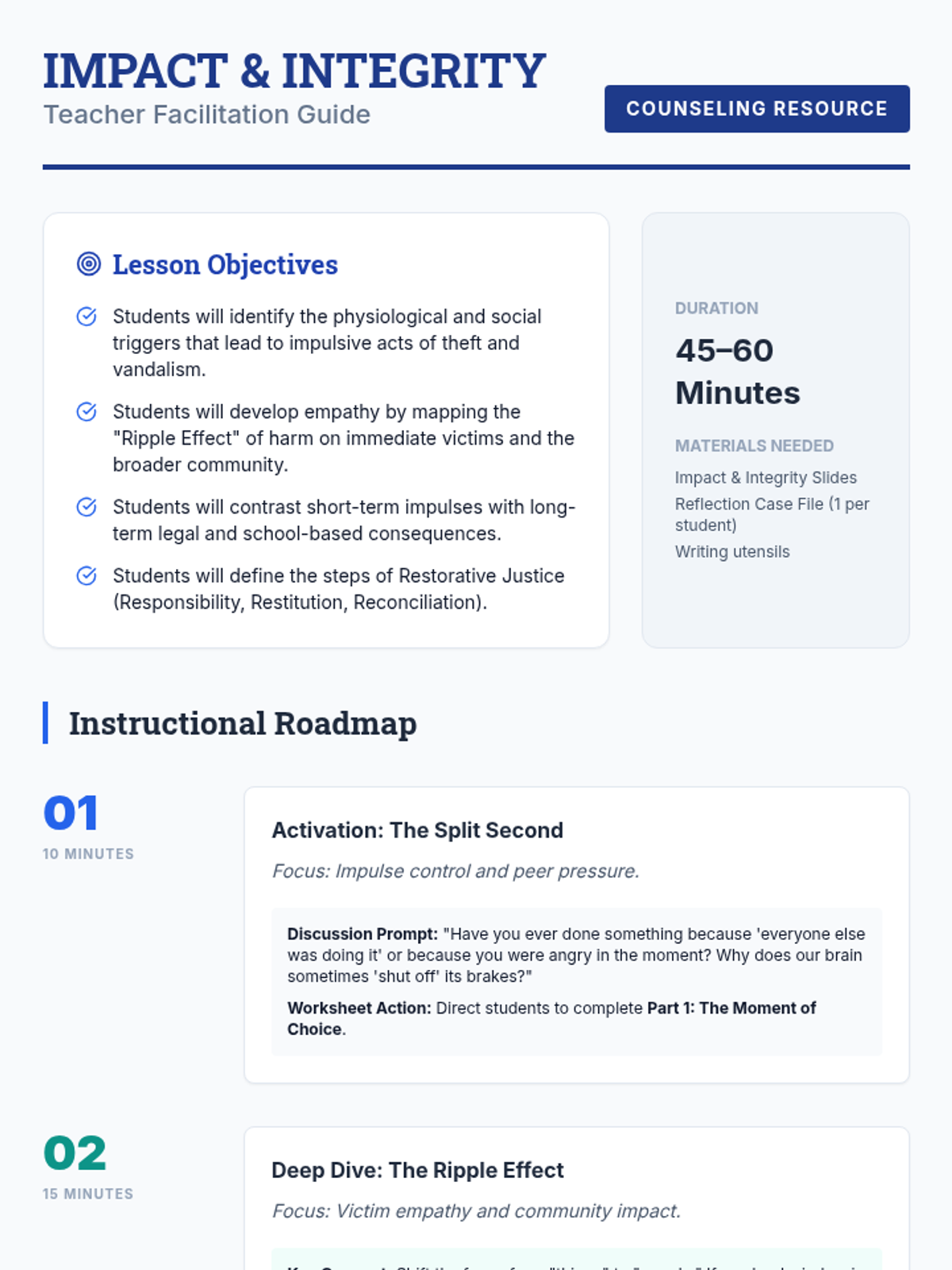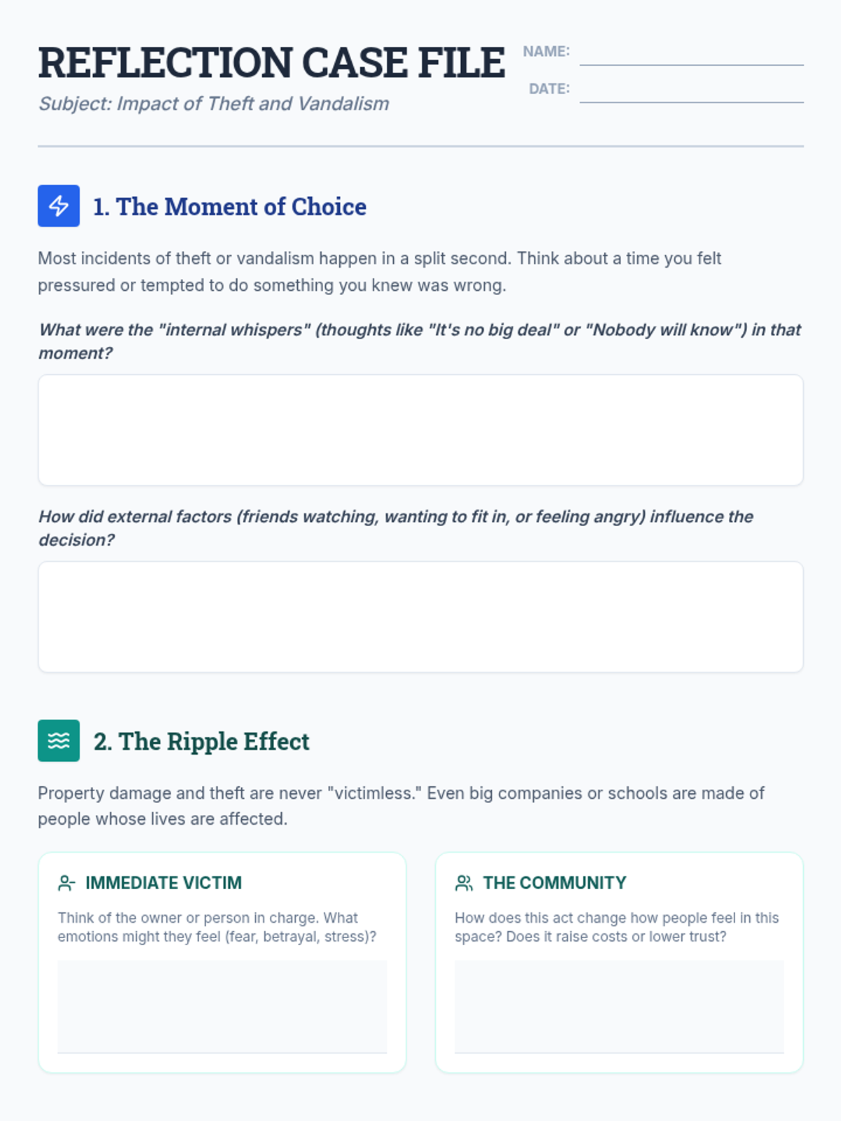 A comprehensive lesson focusing on the personal and social impacts of theft and vandalism, exploring consequences, victim empathy, and restorative practices.