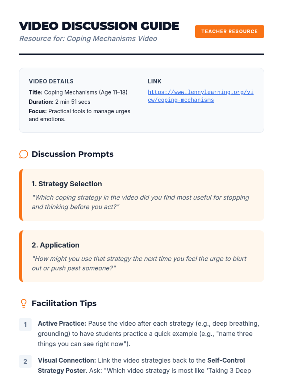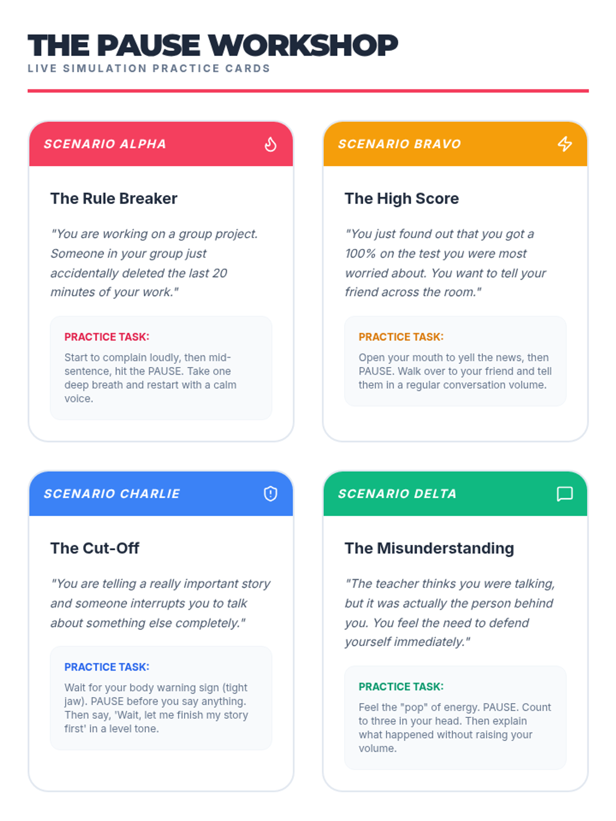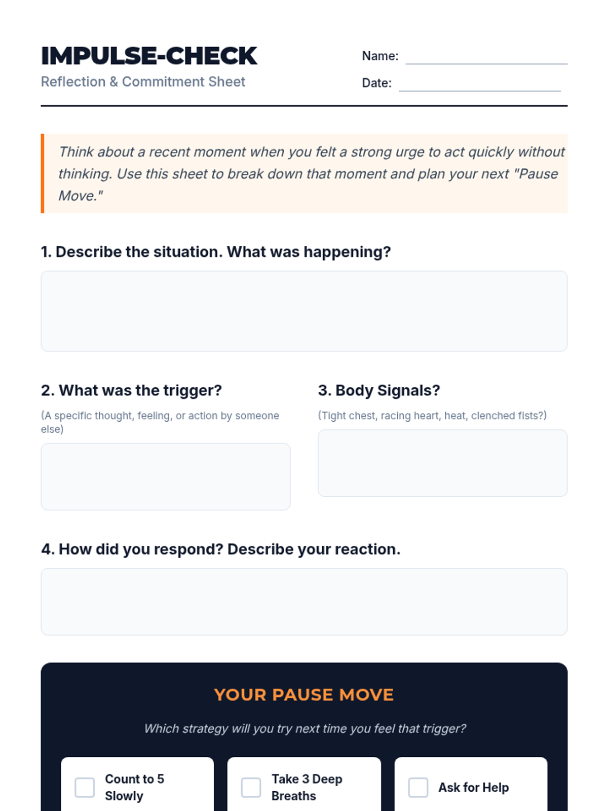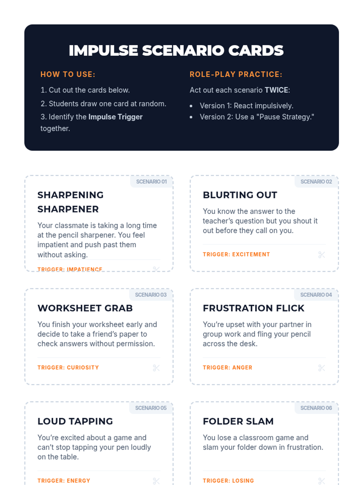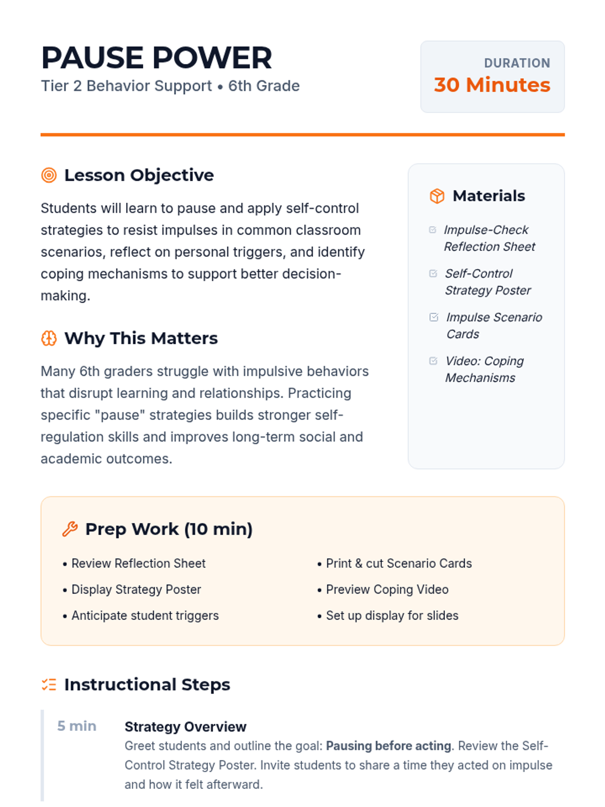 A 30-minute Tier 2 social-emotional learning lesson designed for 6th-grade students to practice self-control. Students explore impulse triggers, learn three core pause strategies, and practice making better decisions through role-play and reflection.