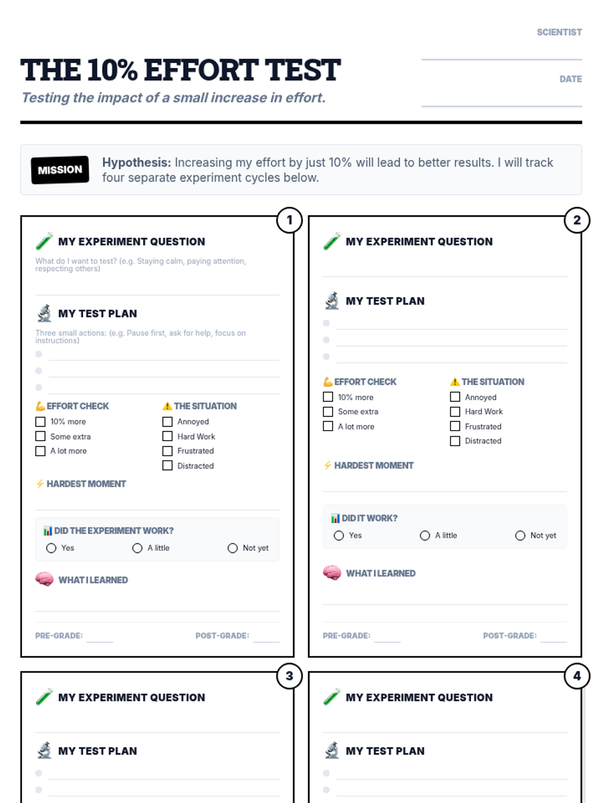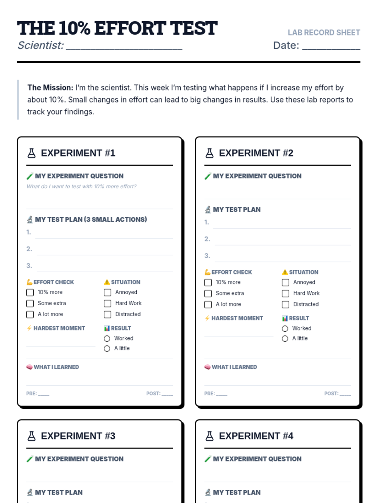 A social-emotional learning lesson where middle school students apply the scientific method to their own behavior, testing if a 10% increase in effort leads to noticeable changes in their academic and personal outcomes.