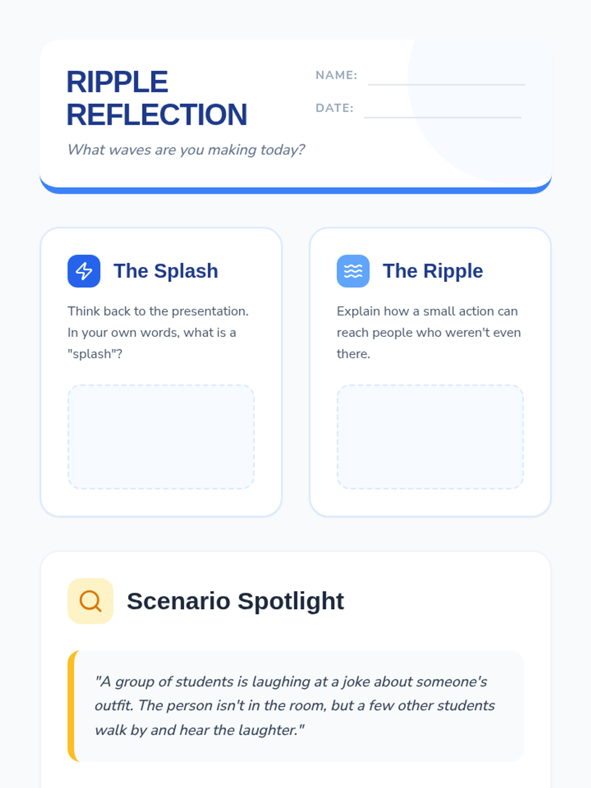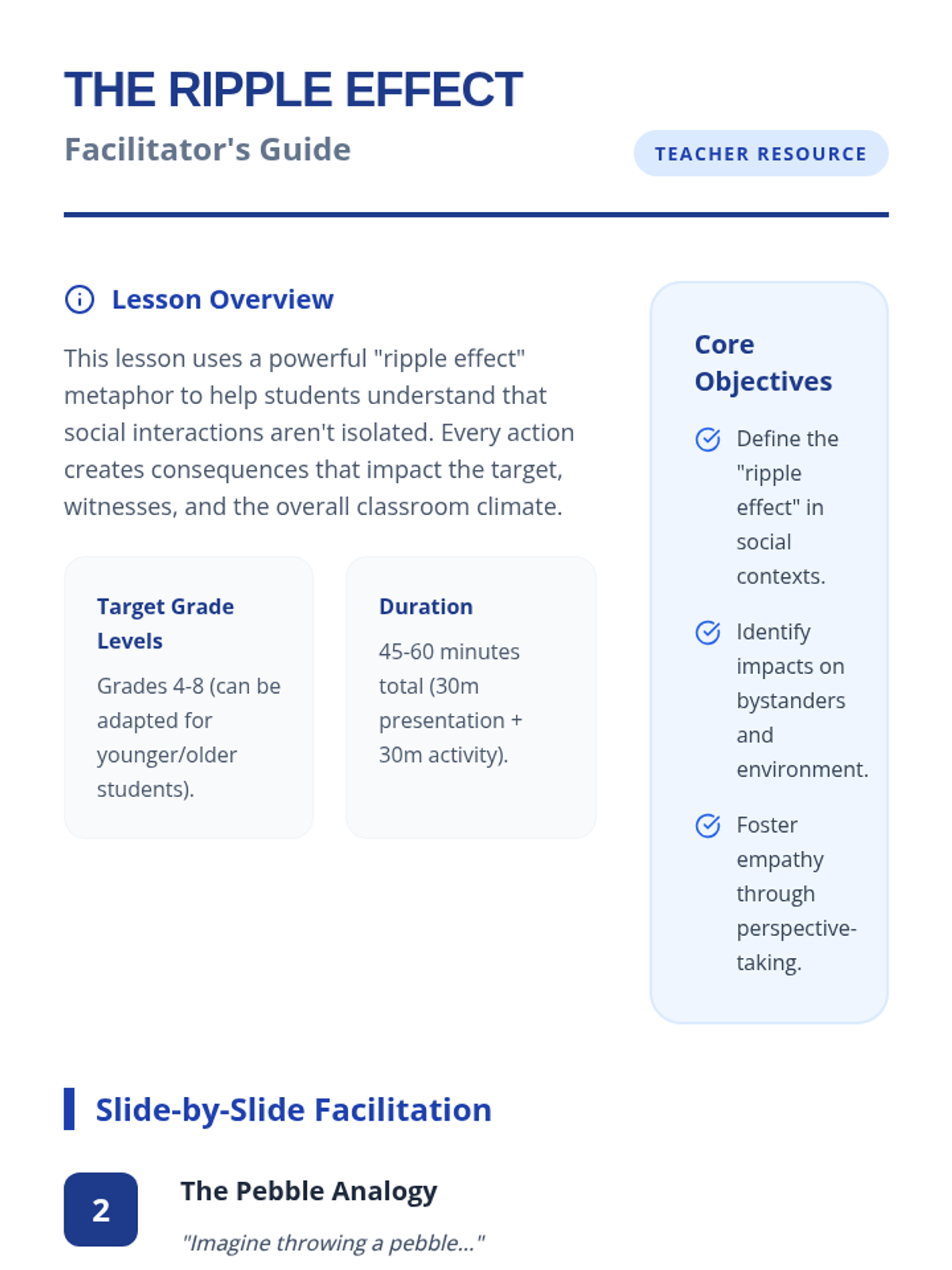 A presentation-focused lesson where students learn about the social consequences of their actions through the 'ripple effect' metaphor and then present these concepts to their peers to build a culture of empathy.