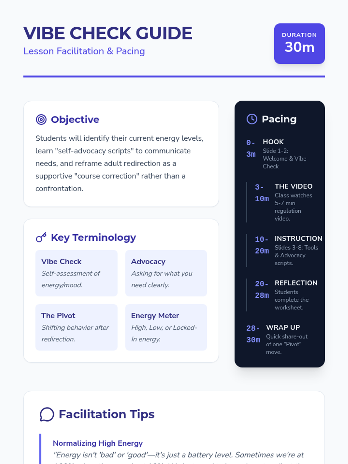 A 30-minute high-impact lesson for middle schoolers focused on self-regulation, advocating for needs, and responding positively to adult redirection. Uses the 'Vibe Check' framework to help students manage their energy and emotions in the classroom.