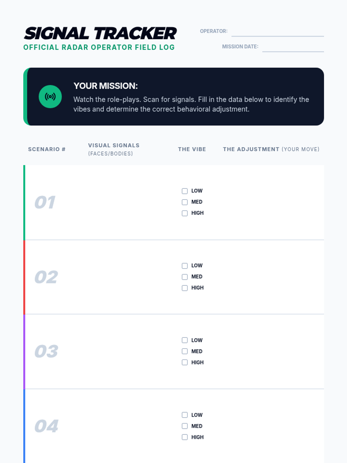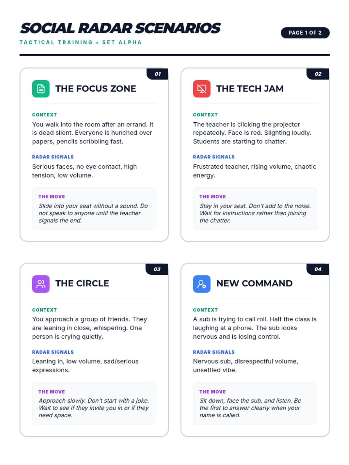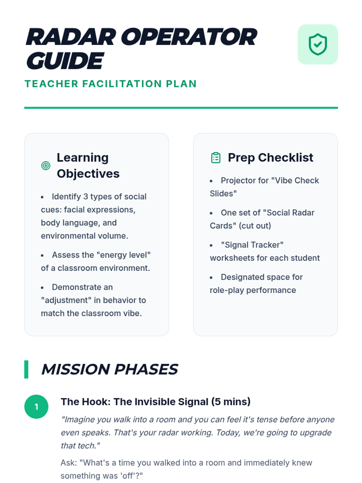 A social awareness lesson focused on the 'reading the room' skill for middle schoolers, using a radar-themed approach to identifying social cues and adjusting behavior.