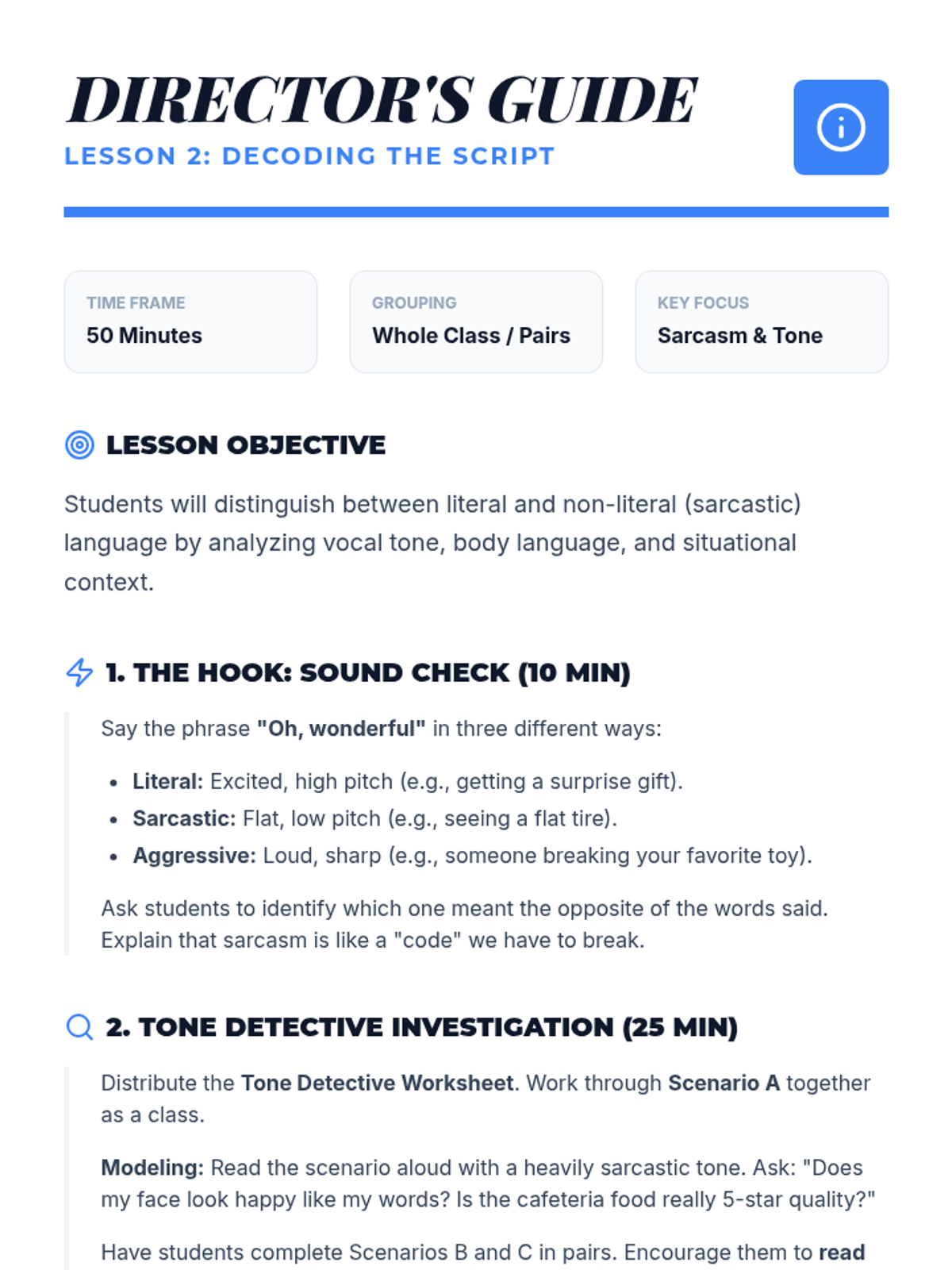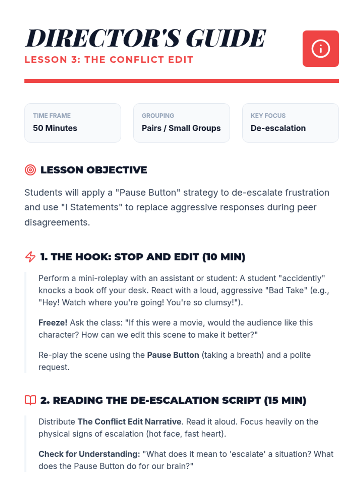 A social-emotional learning lesson designed for students with trauma backgrounds and impulse control challenges. It focuses on 'Scene Scanning'—assuming positive intent and dissecting social interactions through a detective-style lens to improve perspective-taking and reduce reactivity.