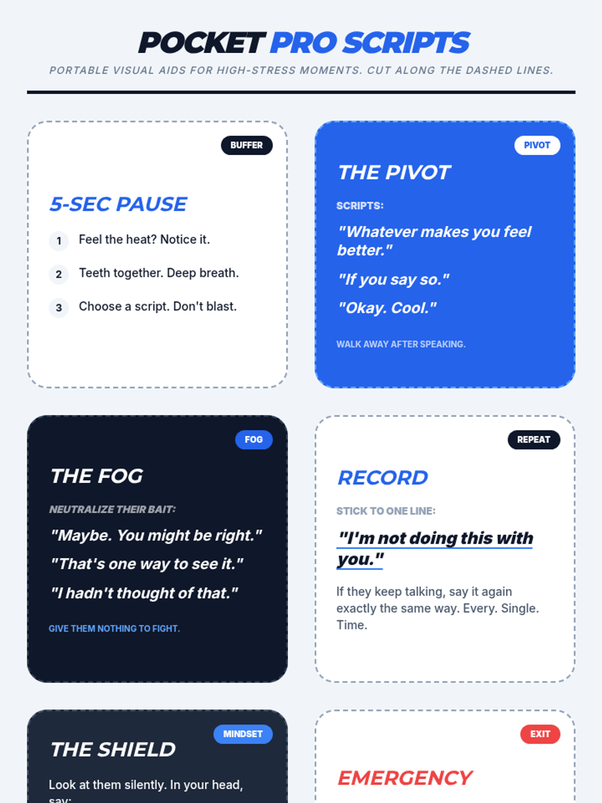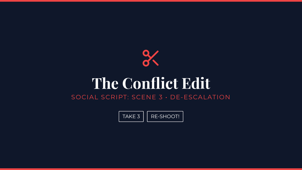 Learners identify the steps of de-escalation through a guided story and practice specific assertive scripts to manage disagreements politely.