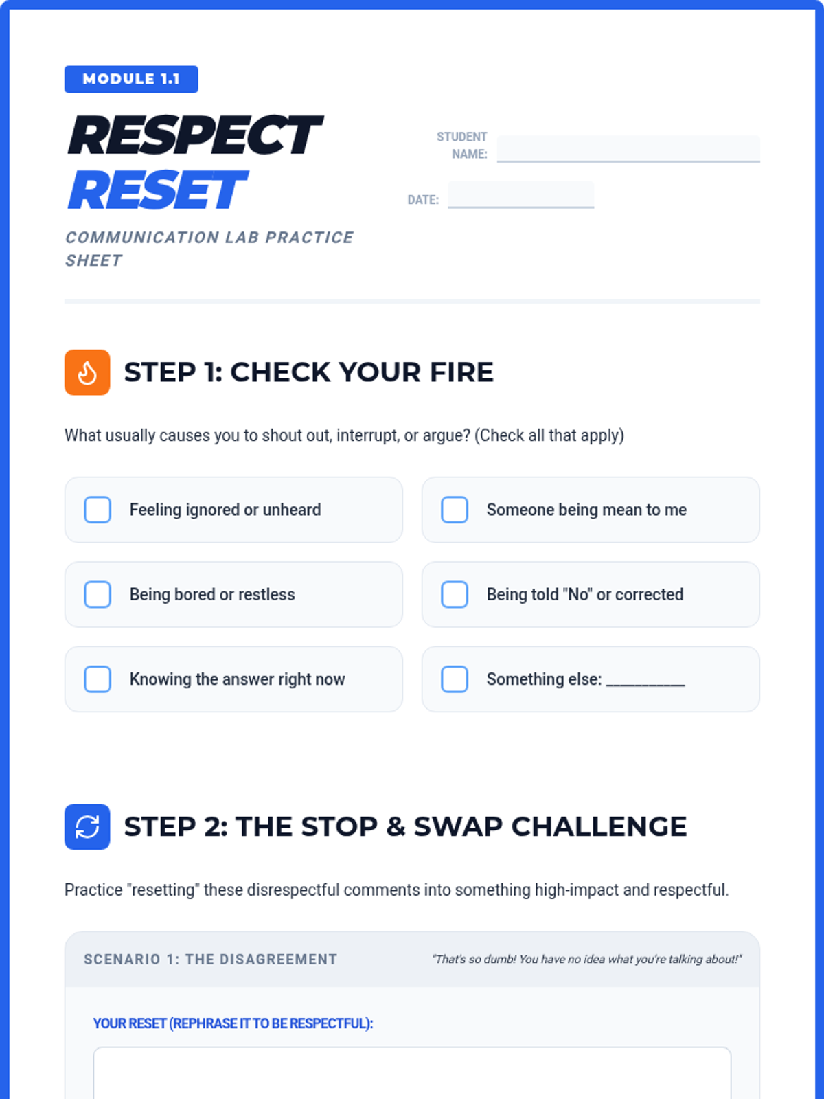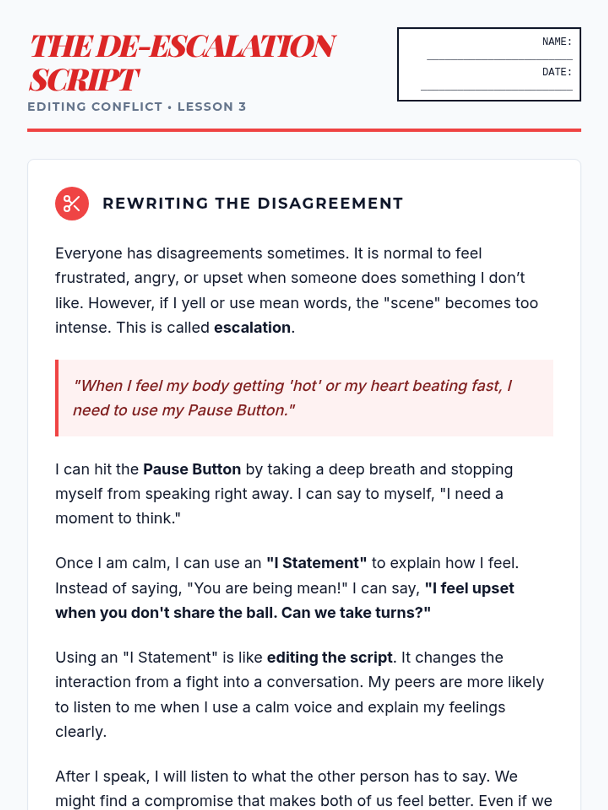 A structured reflection process to help students identify triggers, emotional states, and behavioral outcomes. This lesson provides tools for self-regulation and restorative action.