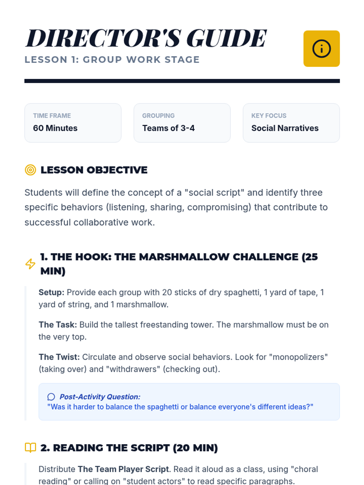 Students explore the roles and expectations within a collaborative group by reading a social narrative about sharing ideas and compromising, then applying it to a marshmallow tower building challenge.