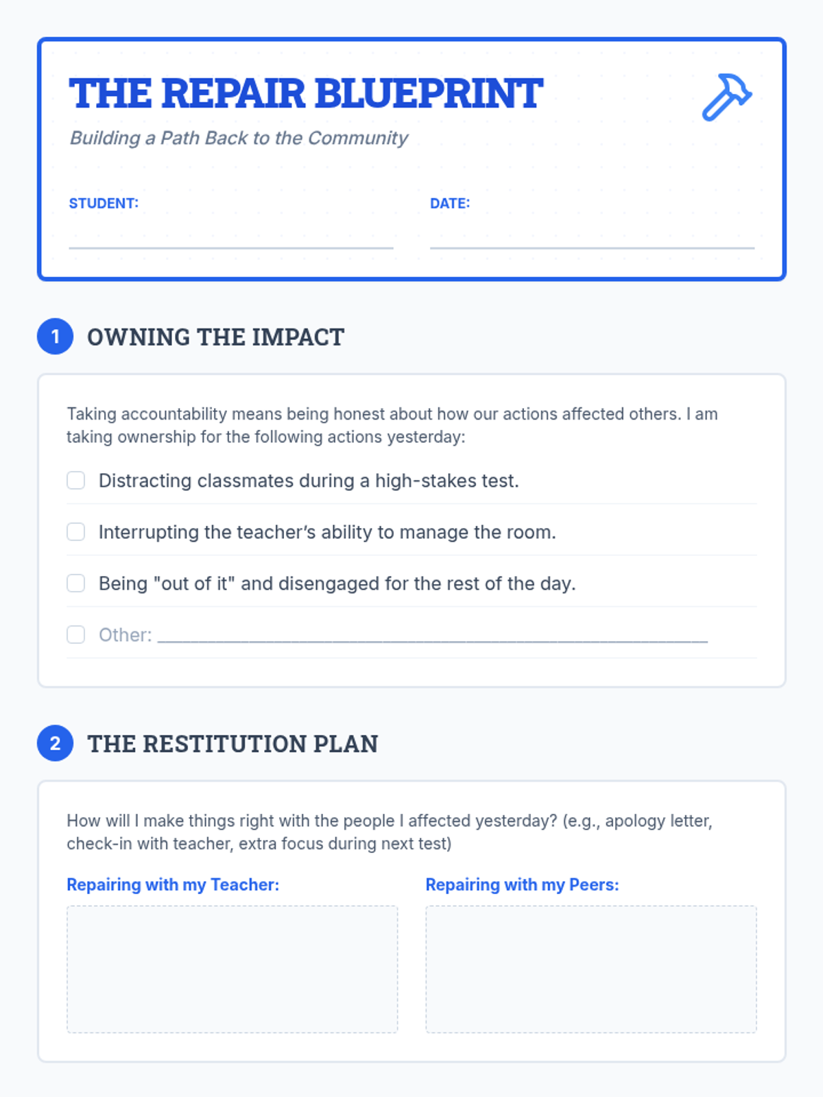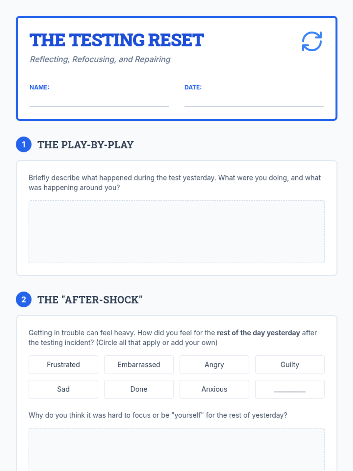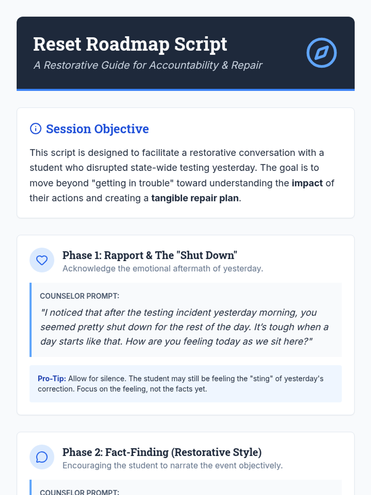 A comprehensive restorative counseling session designed to help a student take accountability for testing disruptions, process the emotional aftermath of getting in trouble, and create a concrete plan to repair relationships and behaviors.