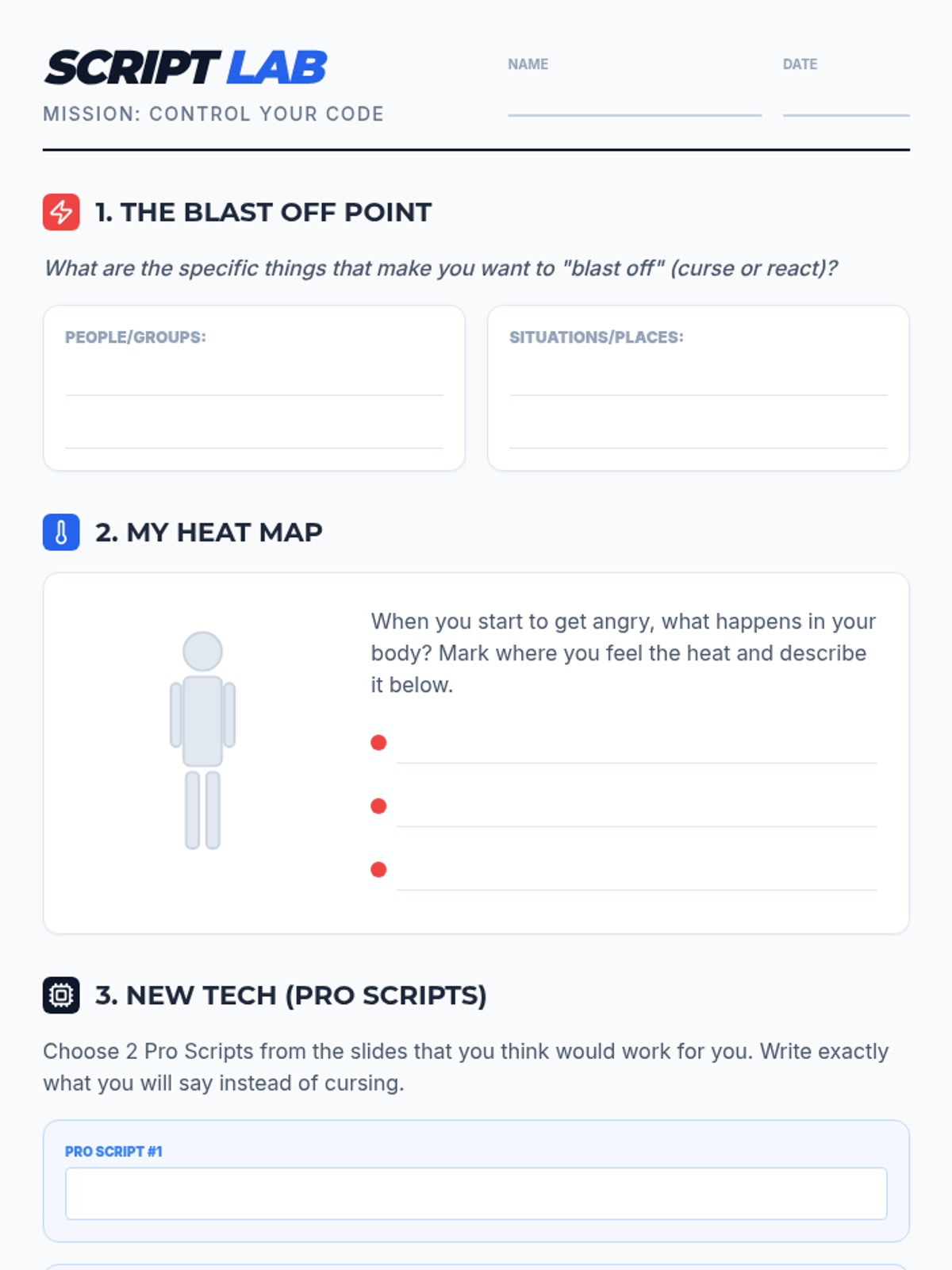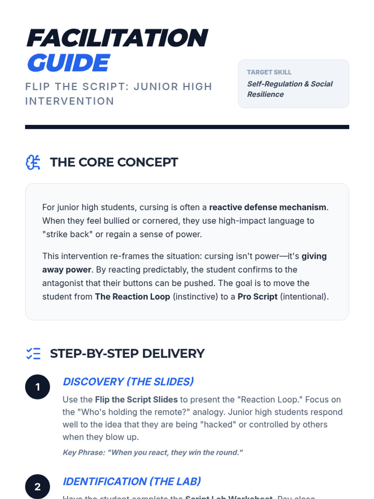 A targeted intervention lesson for junior high students to replace reactive cursing with productive social scripts and emotional regulation techniques. Focuses on reclaiming power from triggers and 'flipping the script' on conflict.
