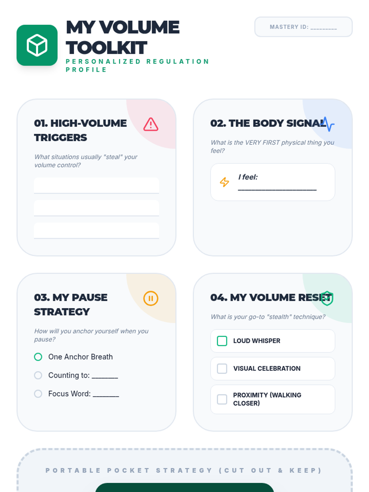 This lesson introduces the 'Pause' technique—stopping speech to take a breath when volume spikes. Students practice recognizing a trigger, pausing, and resetting their volume.