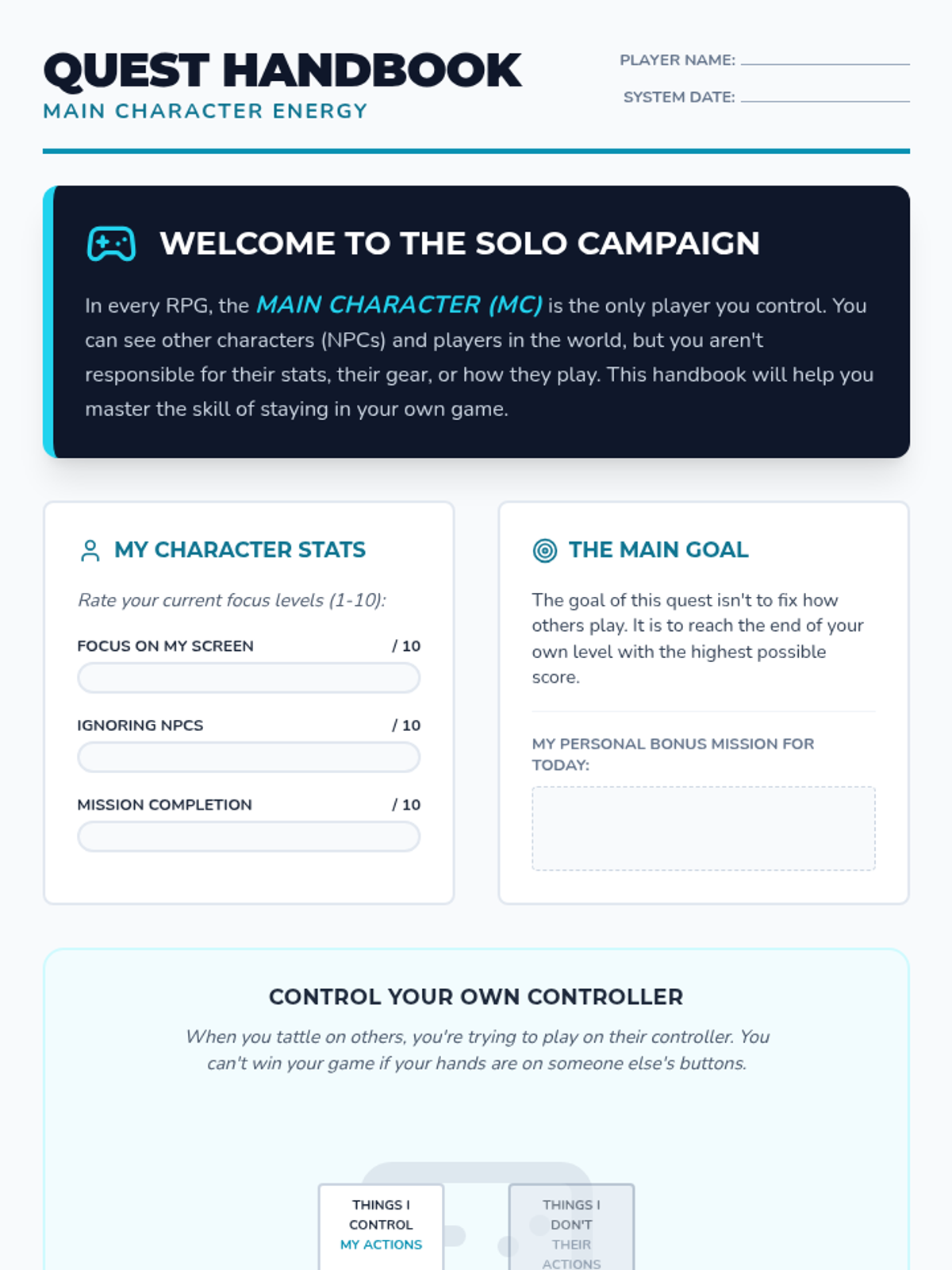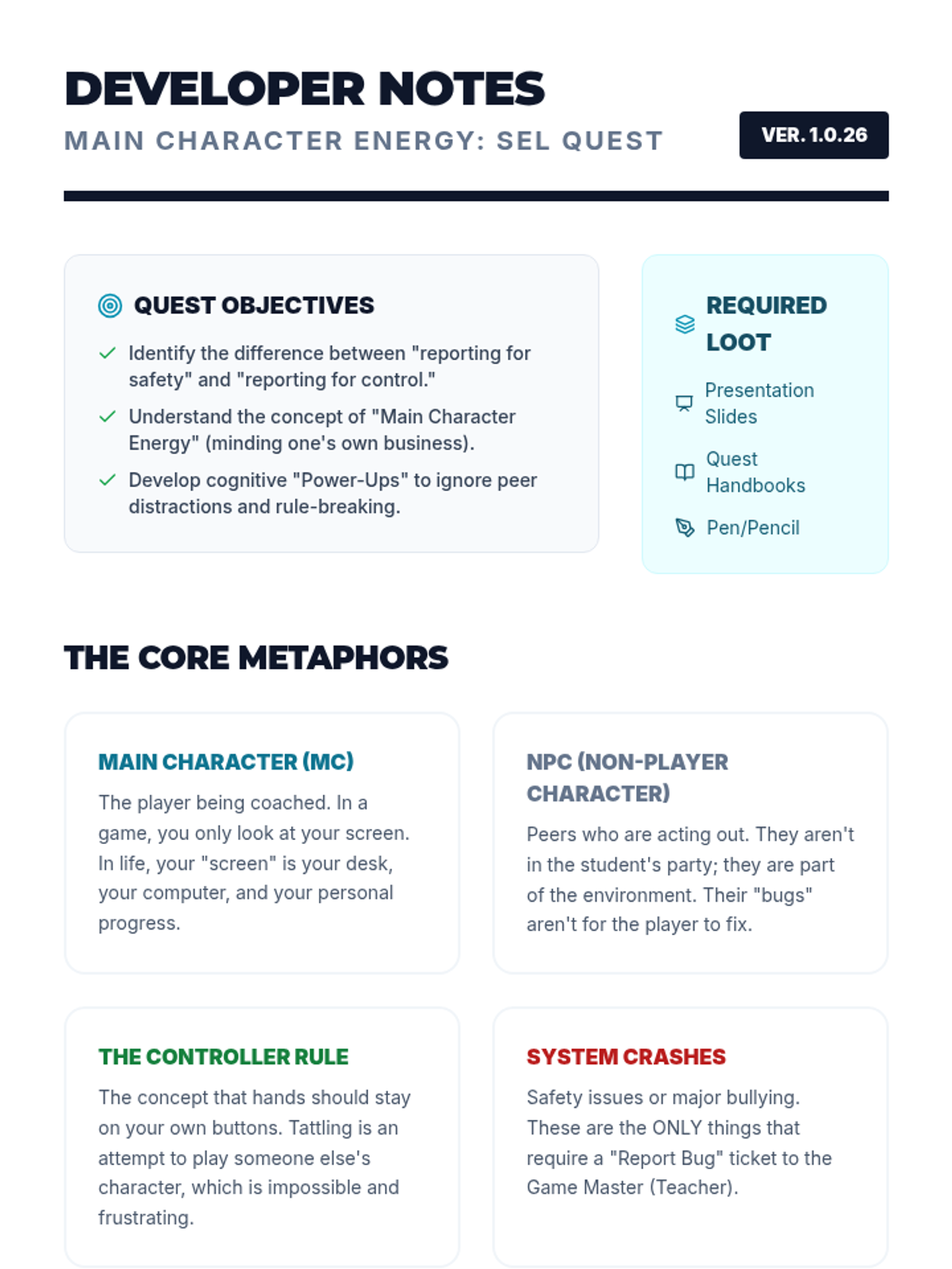 A video game-themed social-emotional learning lesson for 8th graders focused on developing 'Main Character Energy'—the ability to stay focused on one's own tasks and social growth rather than monitoring and reporting the behavior of peers.