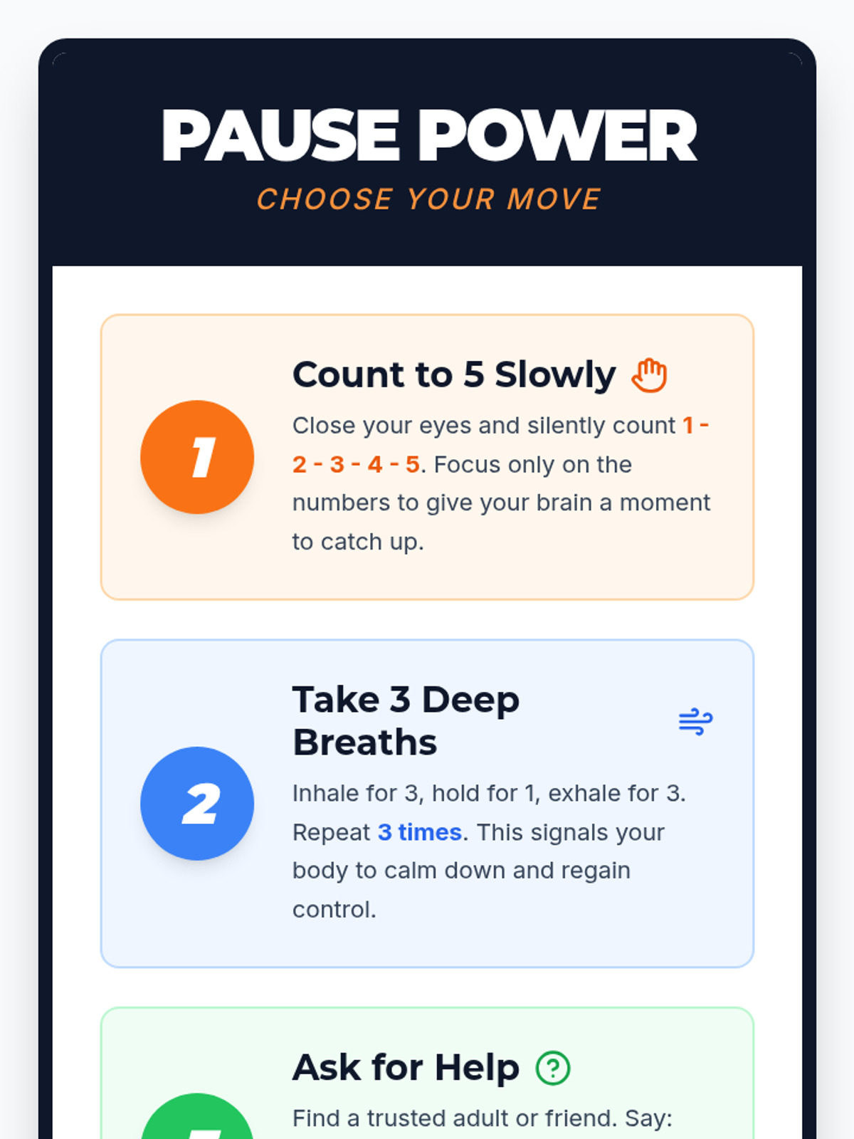Students compile their personal list of strategies (counting, deep breaths, visual reminders) into a portable format. They practice accessing these tools during simulated stress scenarios.