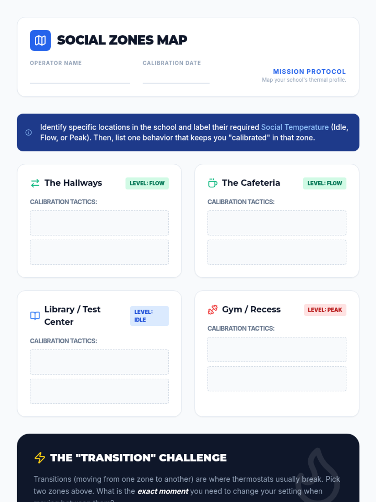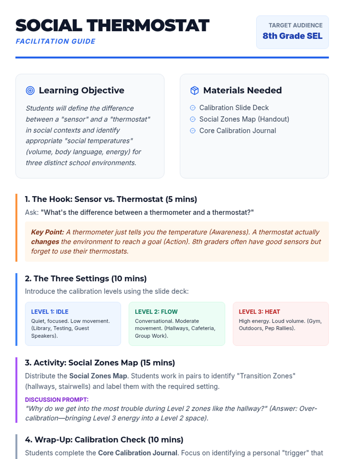 This lesson introduces the 'Social Thermostat' metaphor to help 8th graders develop situational awareness. Students learn to 'read the room' (the sensor) and adjust their volume, tone, and body language (the thermostat) to match different school environments, specifically targeting transitions and unstructured times.