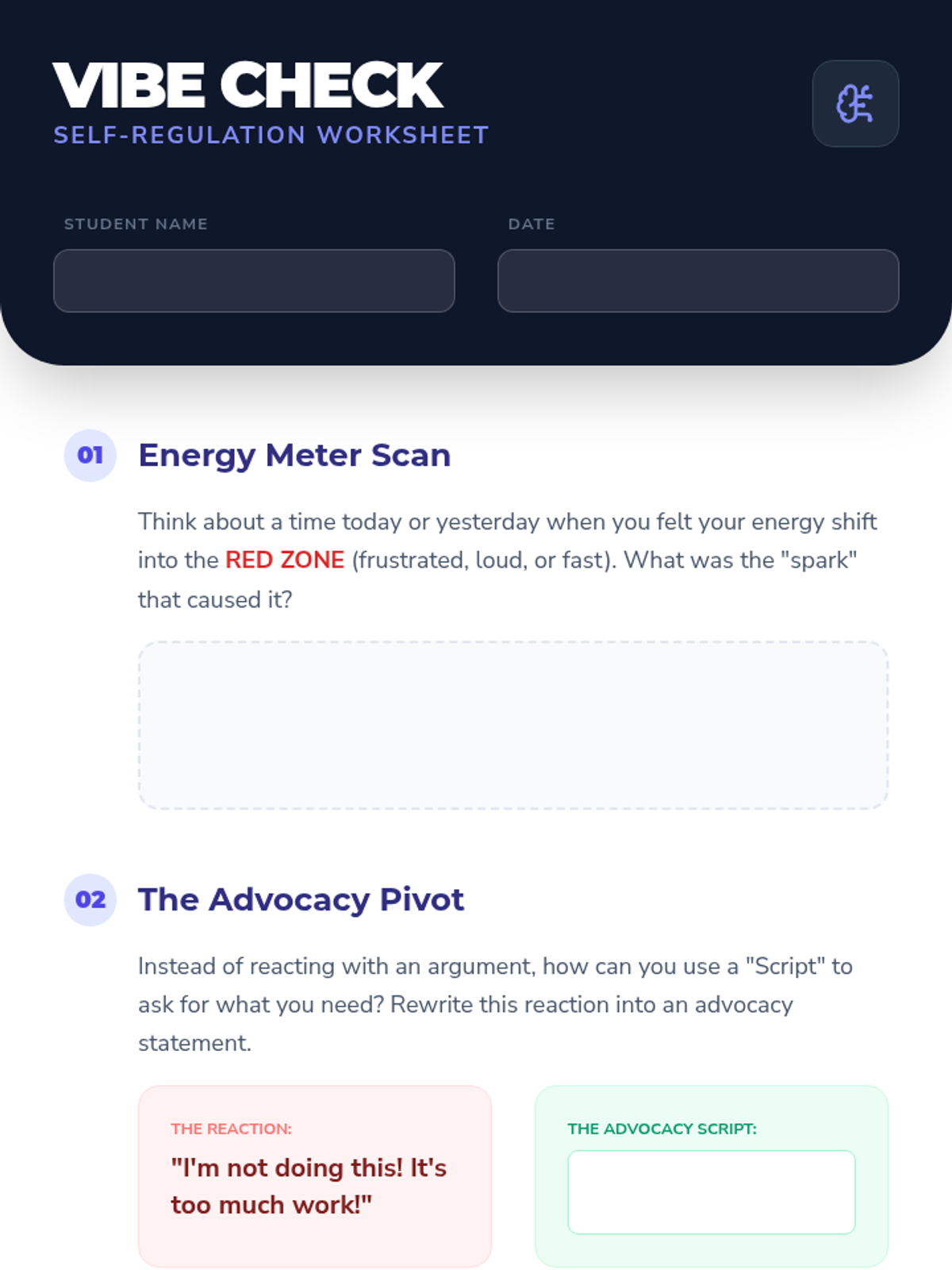 A daily check-in system designed to help students identify their energy levels, emotional states, and regulation needs. Includes a student log and a teacher implementation guide.