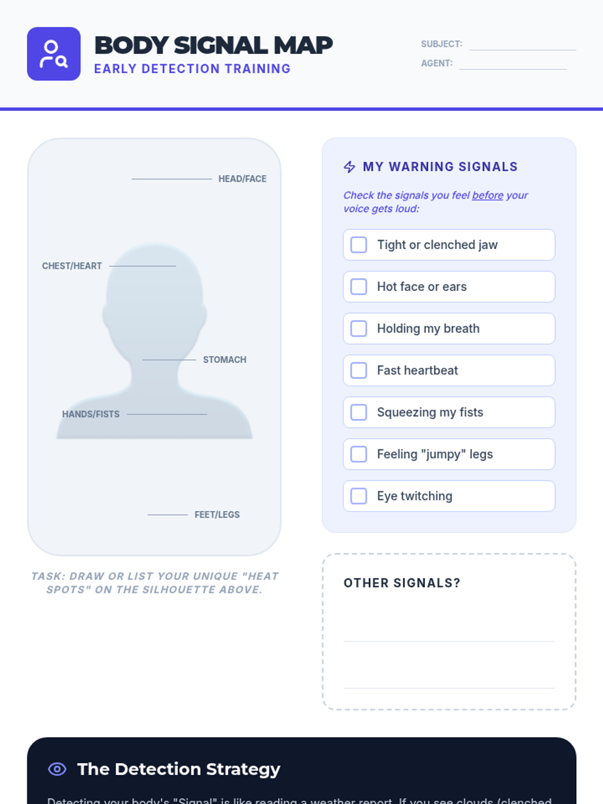 Students learn to identify physical cues (tight chest, clenched jaw) that happen before they yell. This lesson emphasizes catching the escalation early.