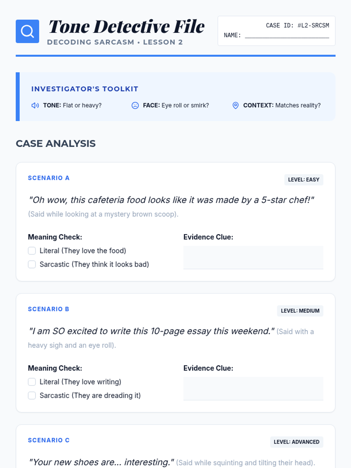 Students analyze the difference between literal and non-literal language, using social narratives to decode sarcasm and practice appropriate responses to social cues.