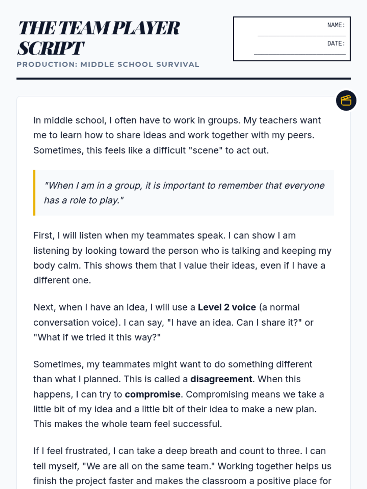 This lesson teaches students the importance of respecting personal space and how to contribute positively to group work. It uses social story modeling to show clear examples of 'expected' behaviors in various classroom scenarios.