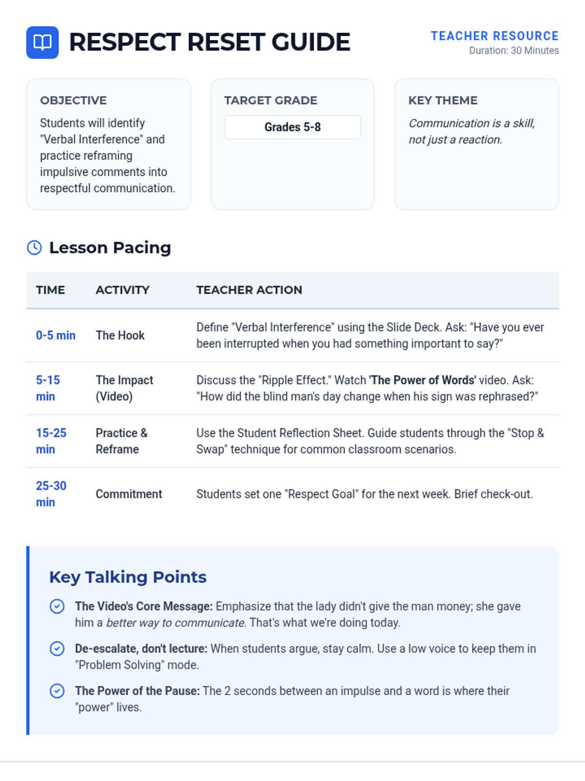A 30-minute intervention lesson designed for middle school students to address verbal interference and disrespectful behavior, focusing on self-awareness and communication strategies.
