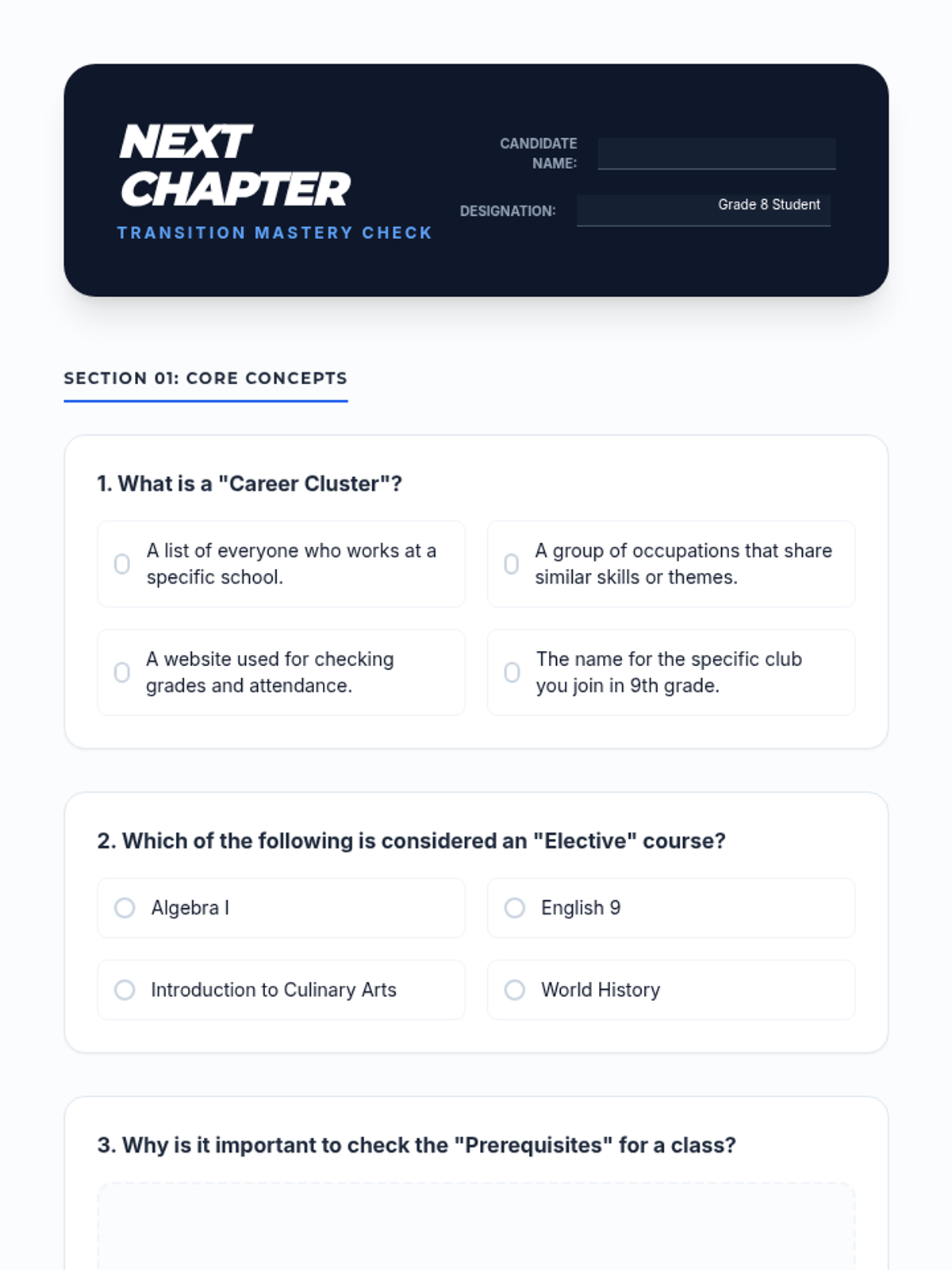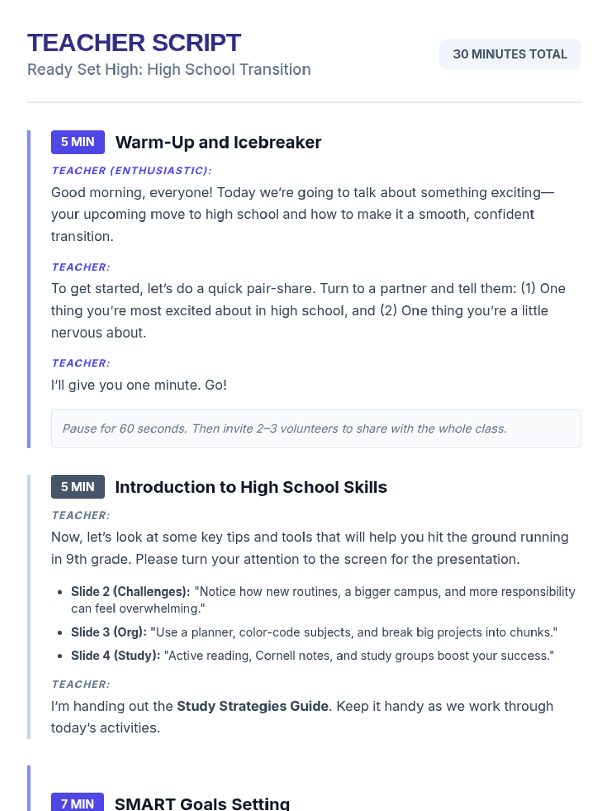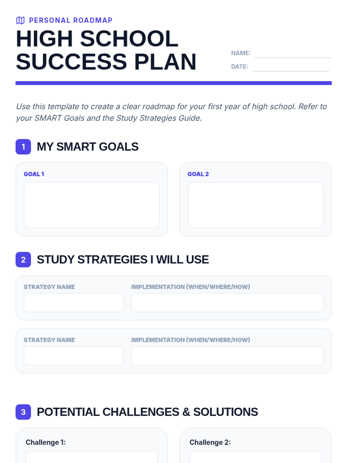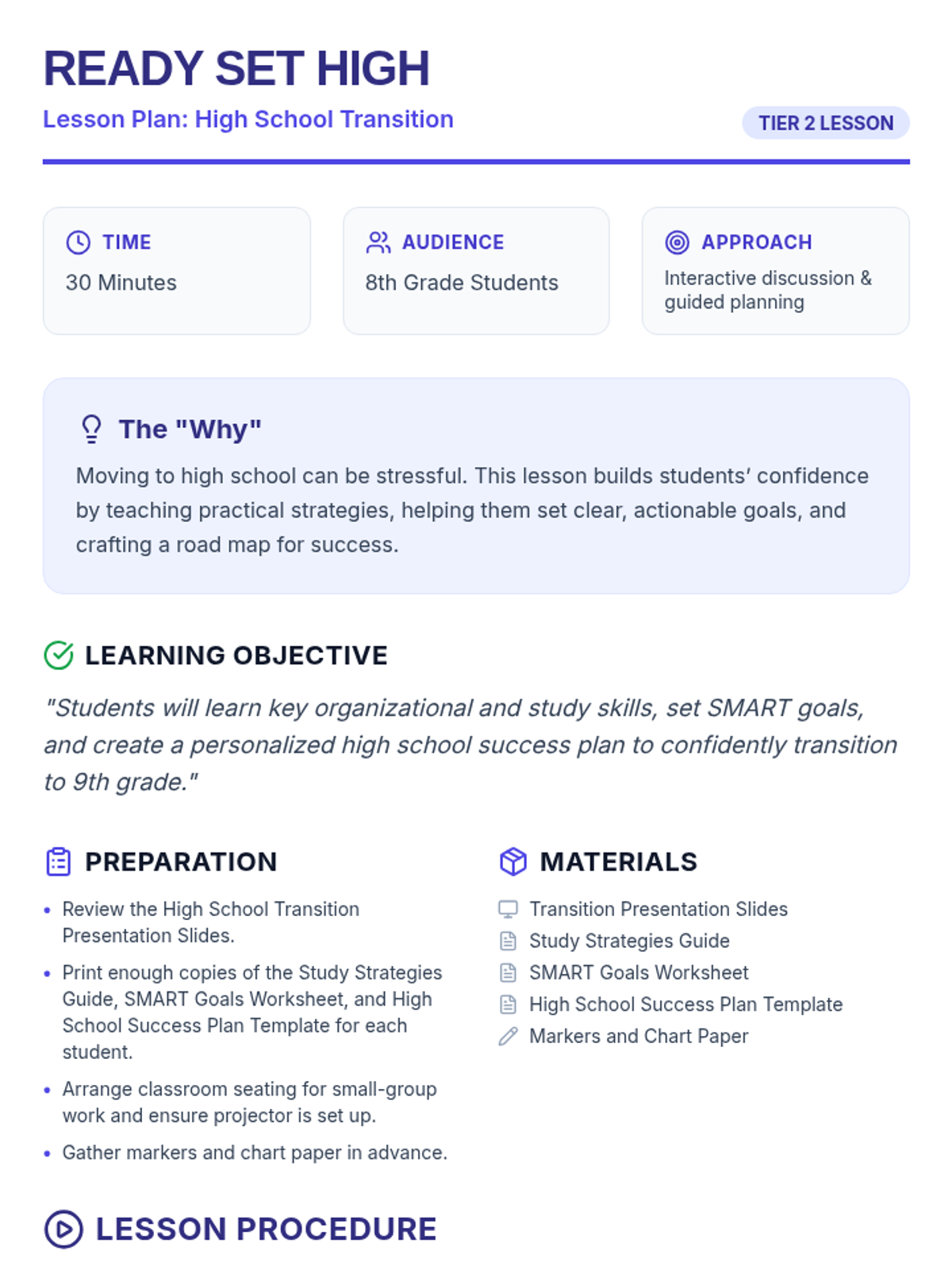 A comprehensive one-session transition lesson for 8th graders to explore high school expectations, build confidence, and create a personal success plan.