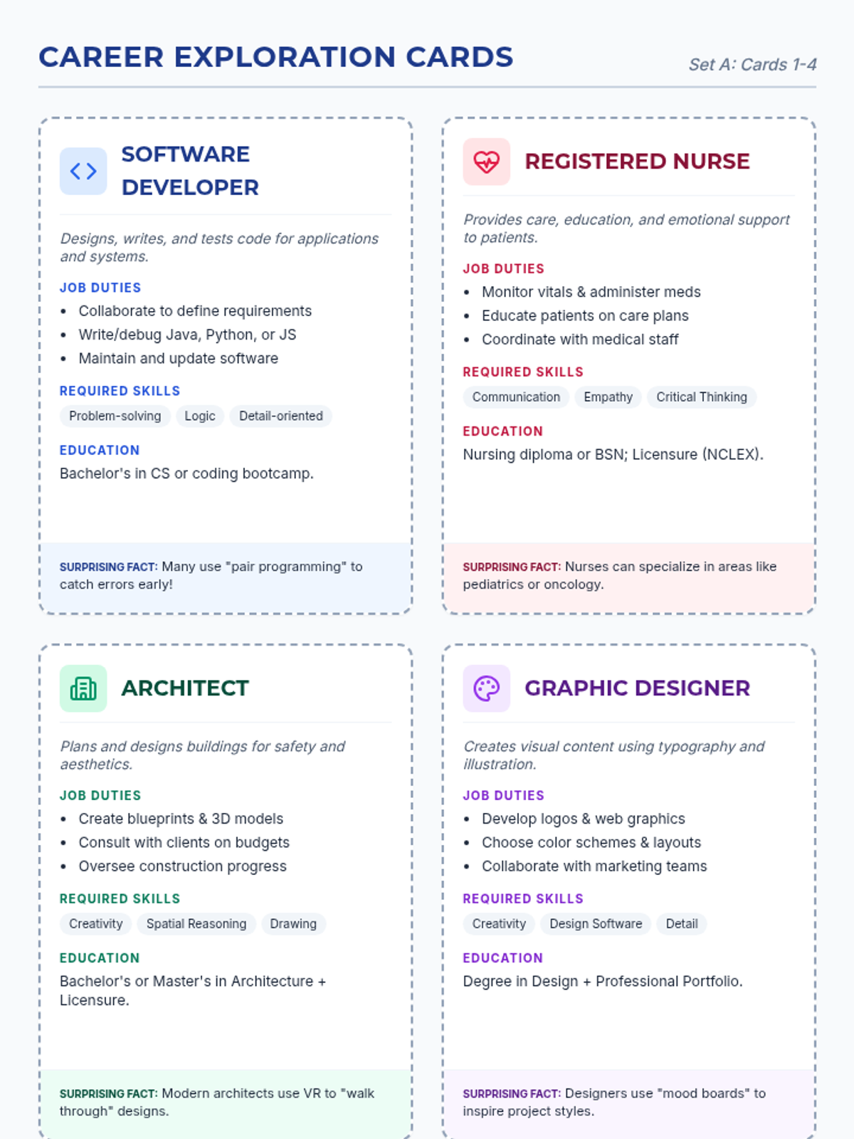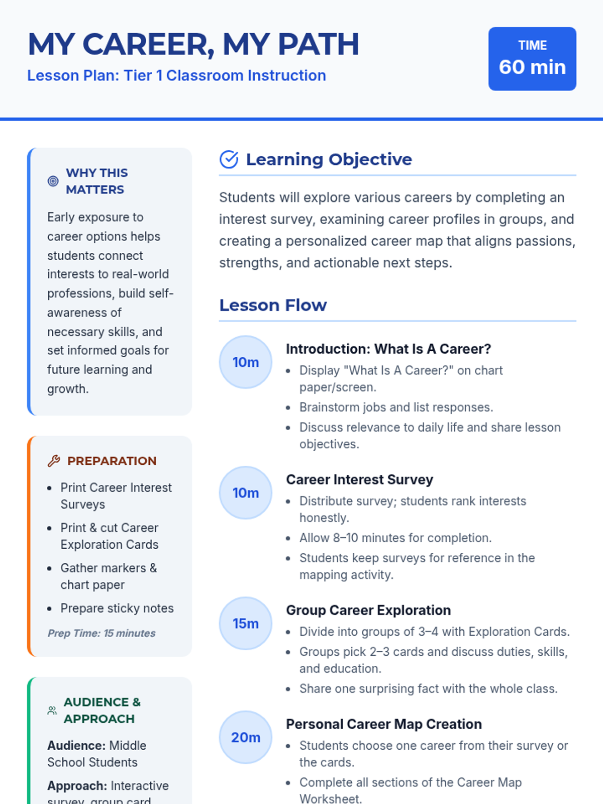This lesson helps middle schoolers explore career options and understand the skills needed for their interests through an interactive survey, group card exploration, and personalized career mapping.