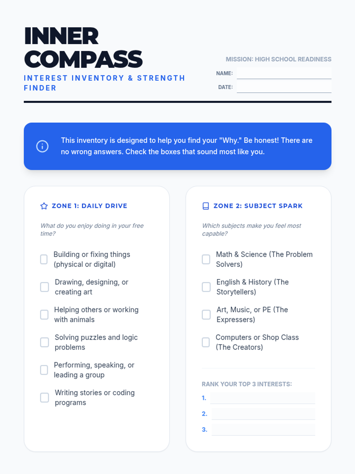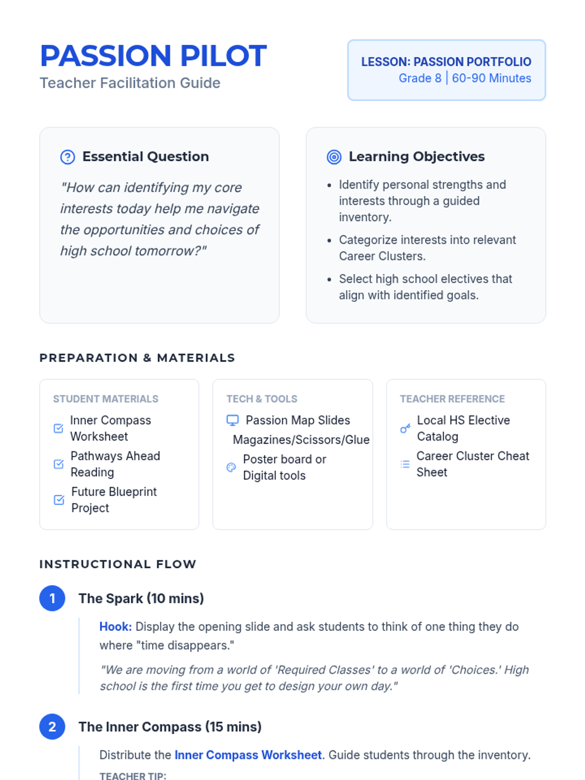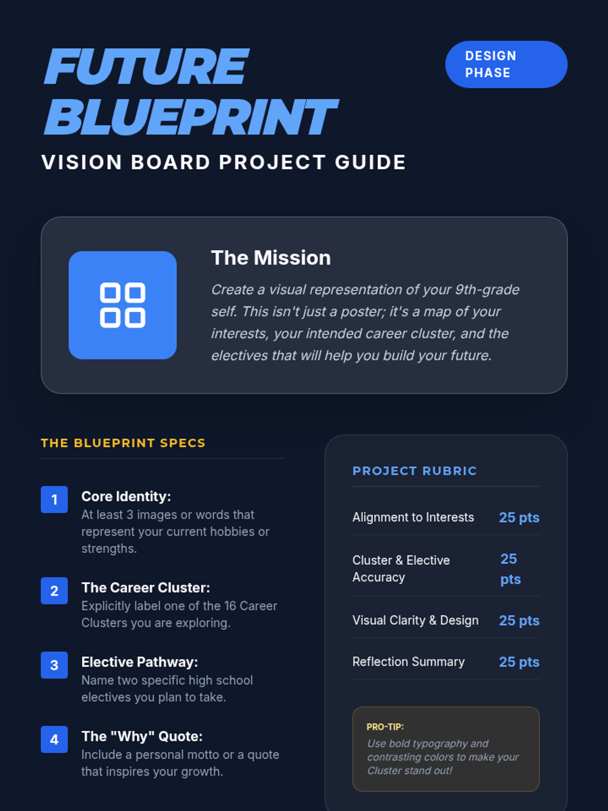 A transitional lesson for 8th graders to identify their personal interests and align them with high school career clusters and elective pathways. Students engage in self-reflection and creative vision boarding to prepare for the transition to high school with a clear sense of purpose.