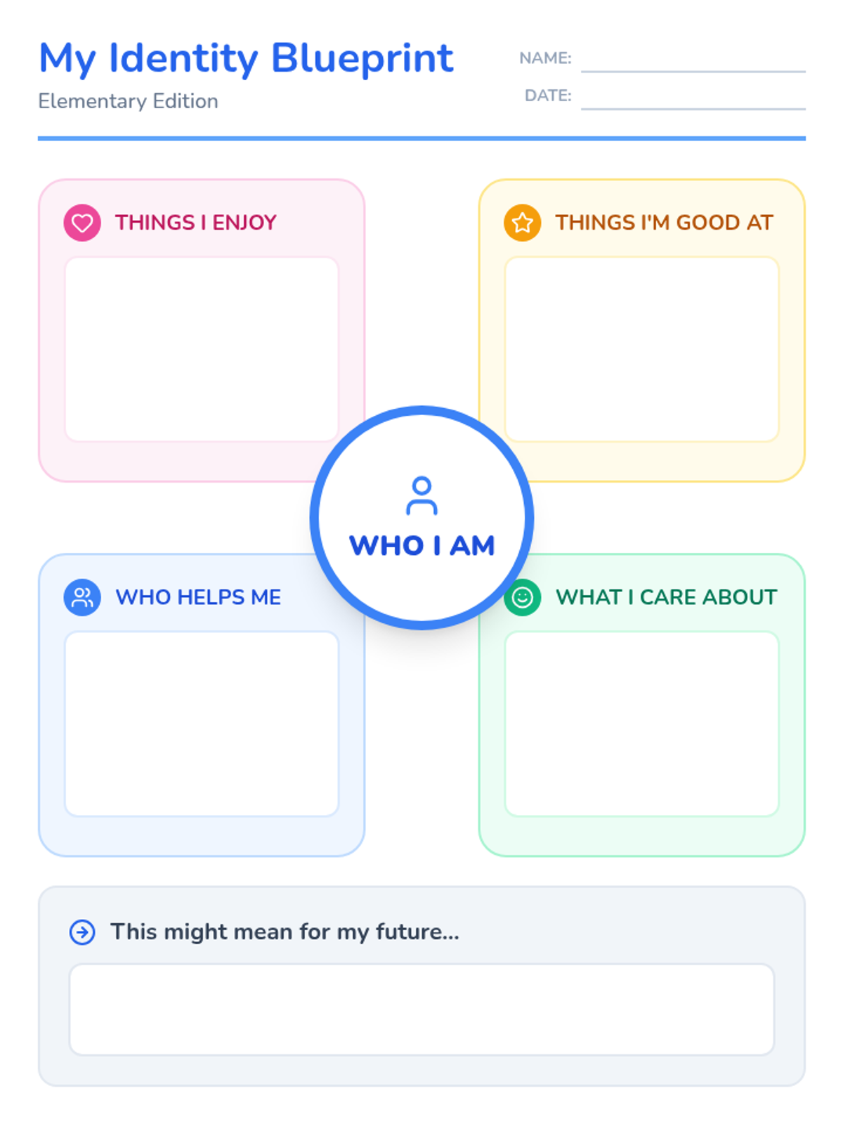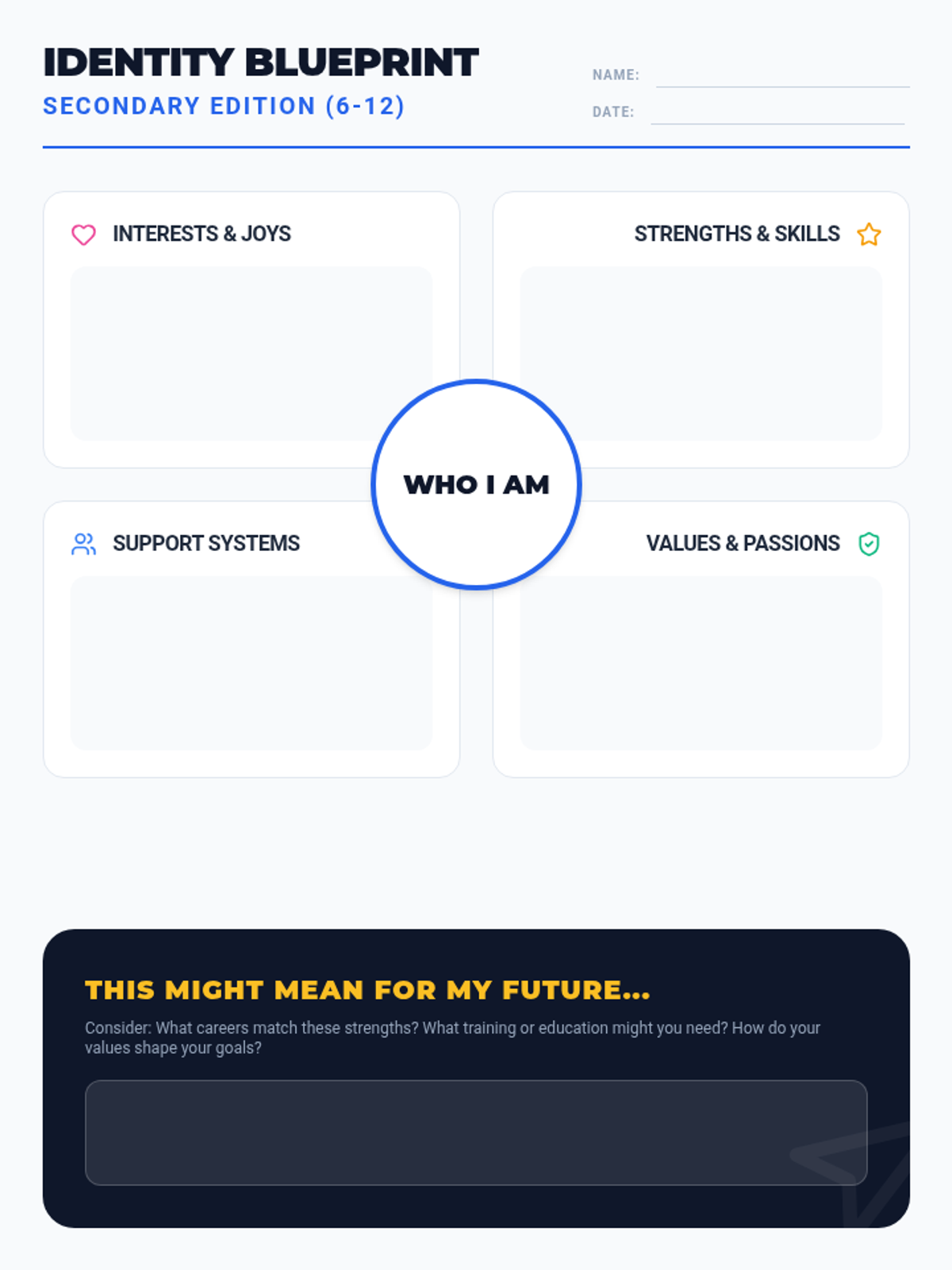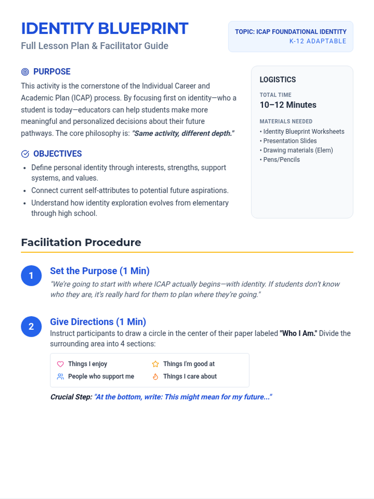 A comprehensive lesson package for the 'Who I Am -> Who I'm Becoming' activity, designed to build self-awareness and connect student identity to future career and academic pathways across K-12.