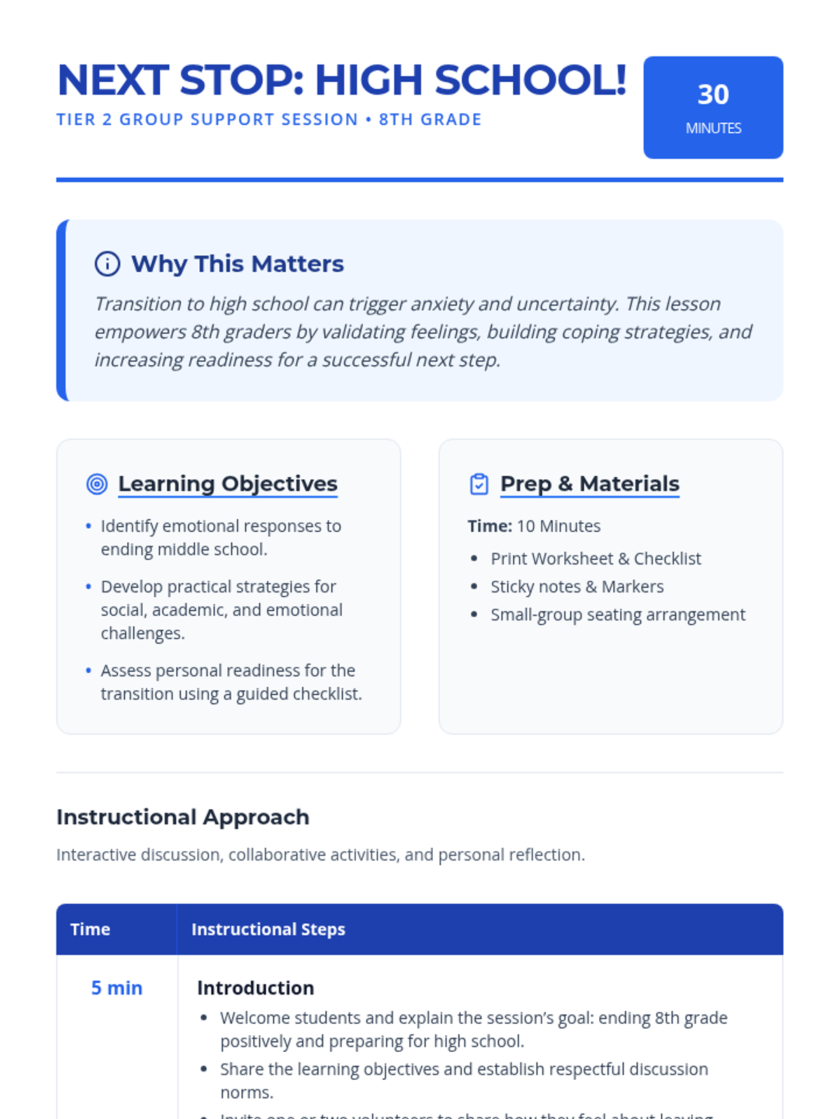 A 30-minute Tier 2 group support session for 8th graders focused on navigating the emotional and practical transition from middle school to high school.