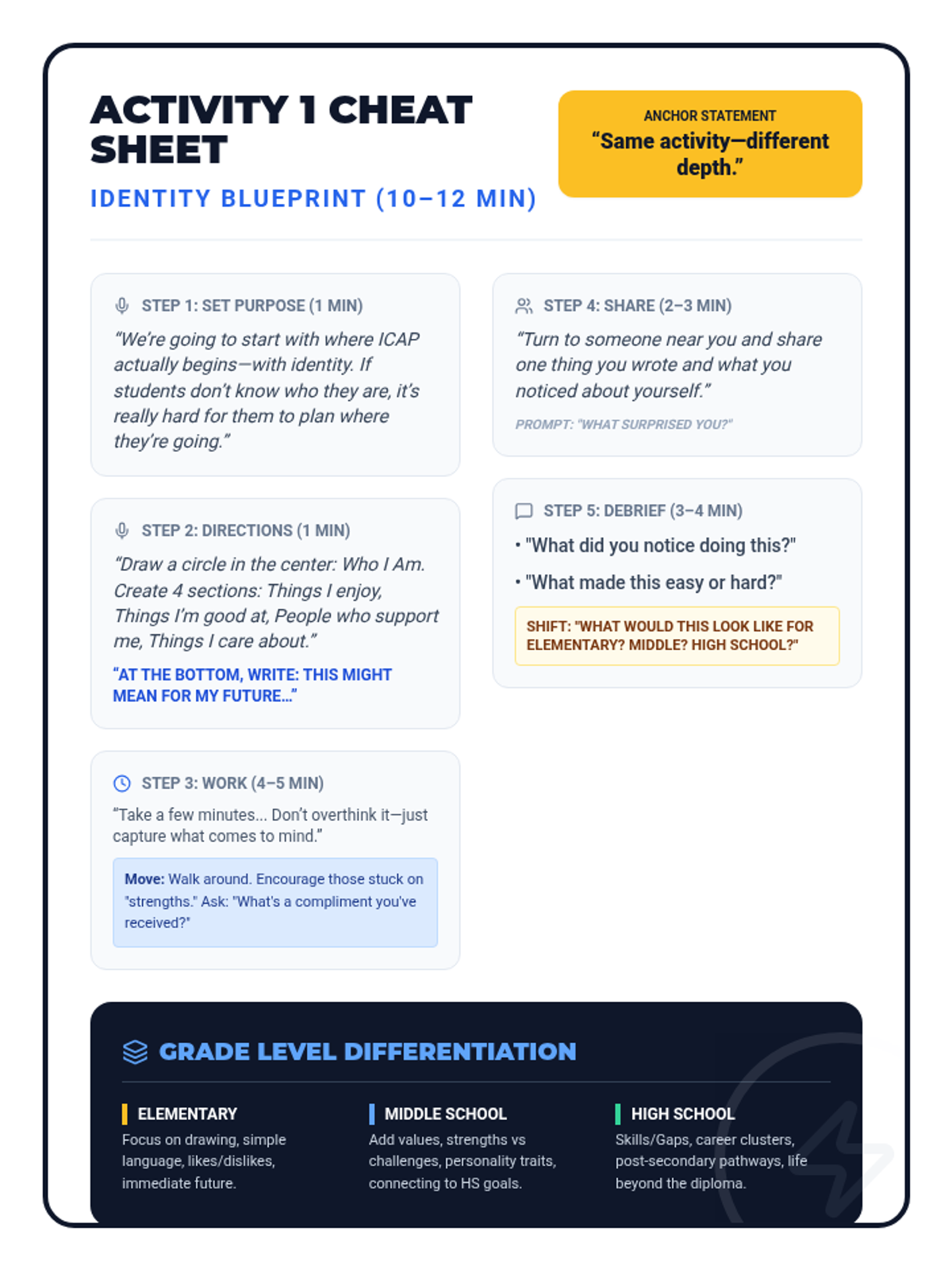 A transition-focused lesson that moves students from personal vision to concrete action steps through the ICAP framework, tailored for Elementary, Middle, and High School levels.