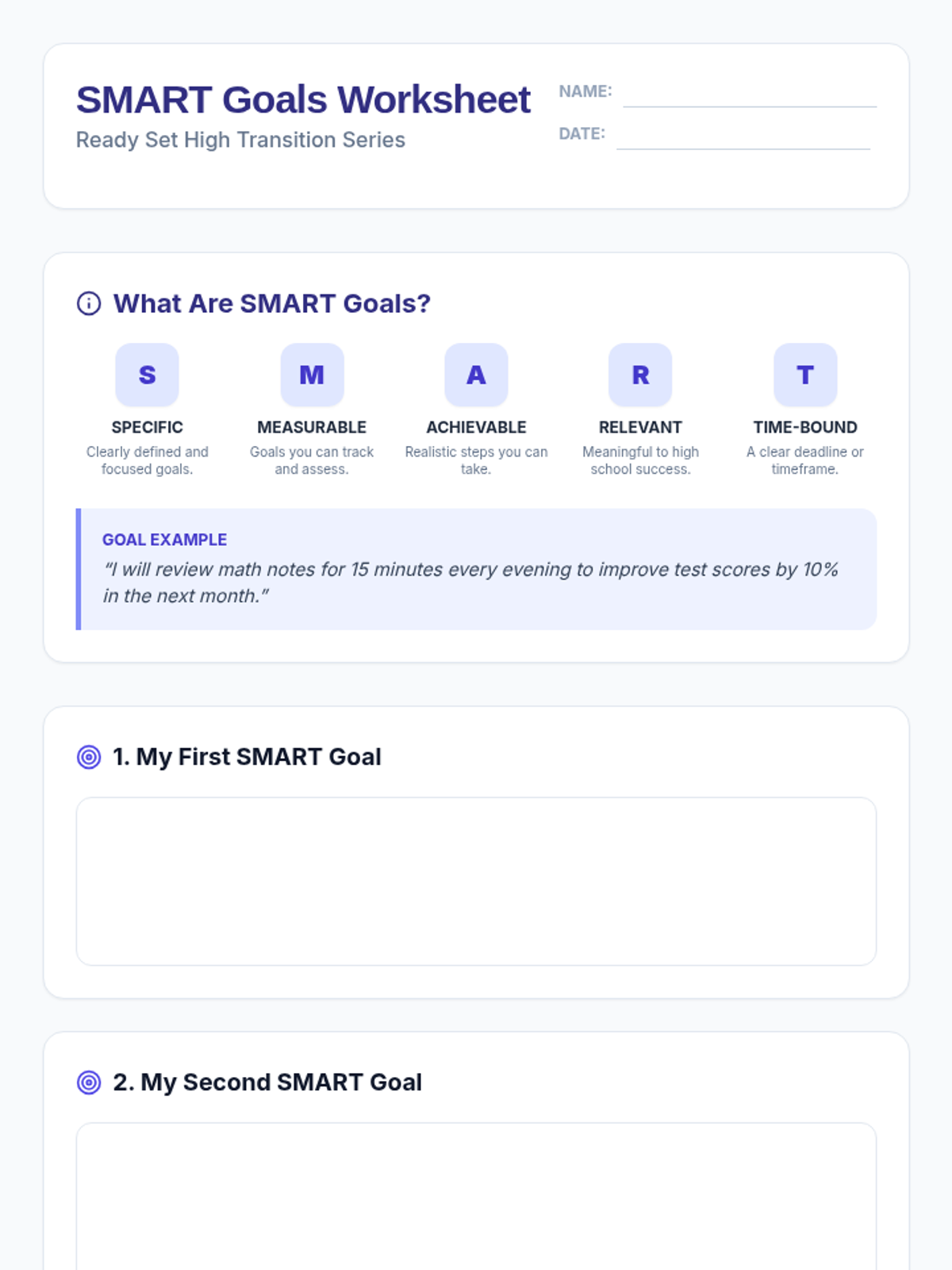 A 30-minute Tier 2 lesson for 8th graders to explore organizational skills, set SMART goals, and create a personalized success plan for their transition to high school.