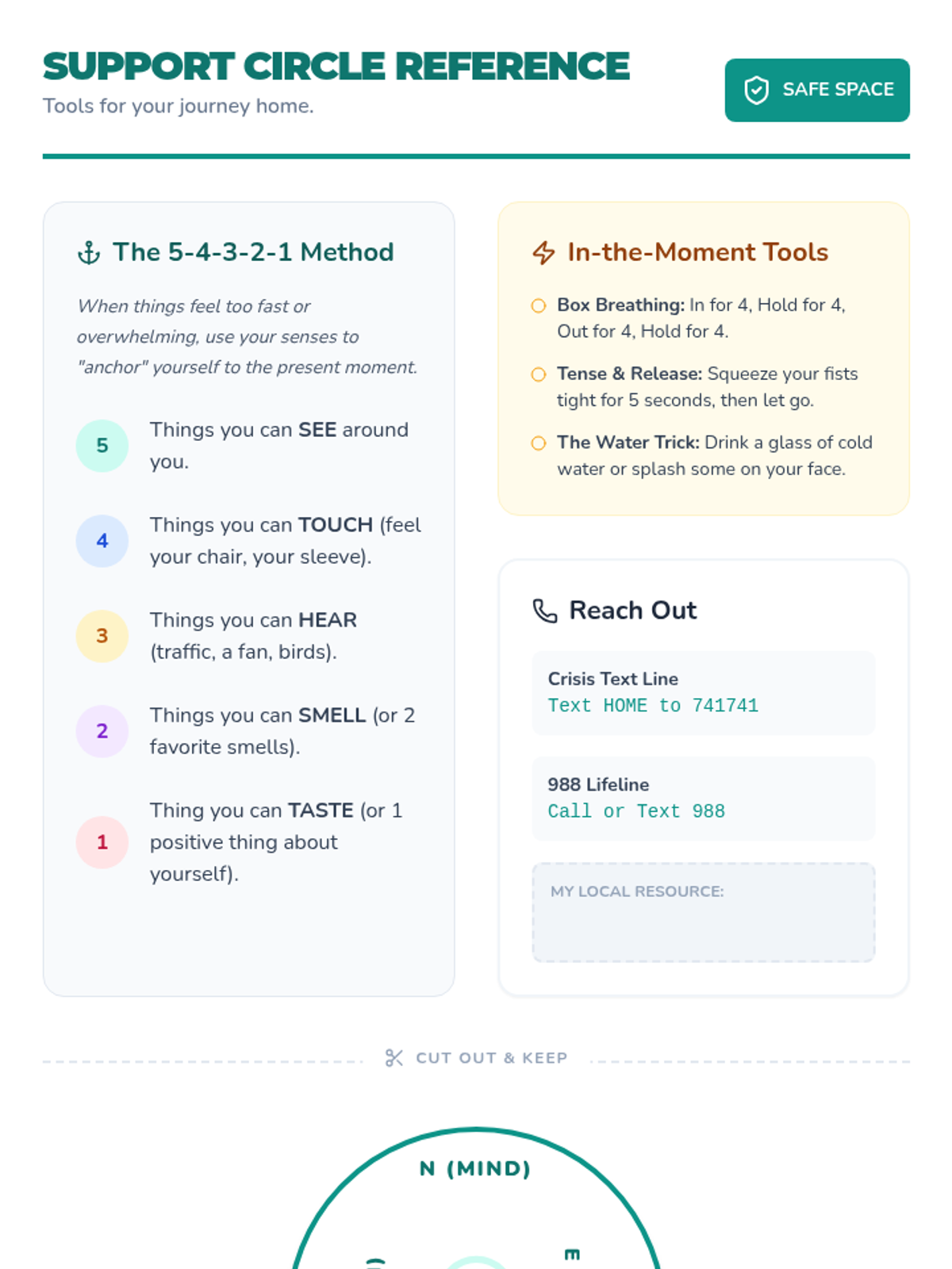 Identifies mental health crises and suicide warning signs while developing personal safety plans and grounding techniques. Equips users with peer gatekeeper skills and direct pathways to professional crisis resources and hotlines.