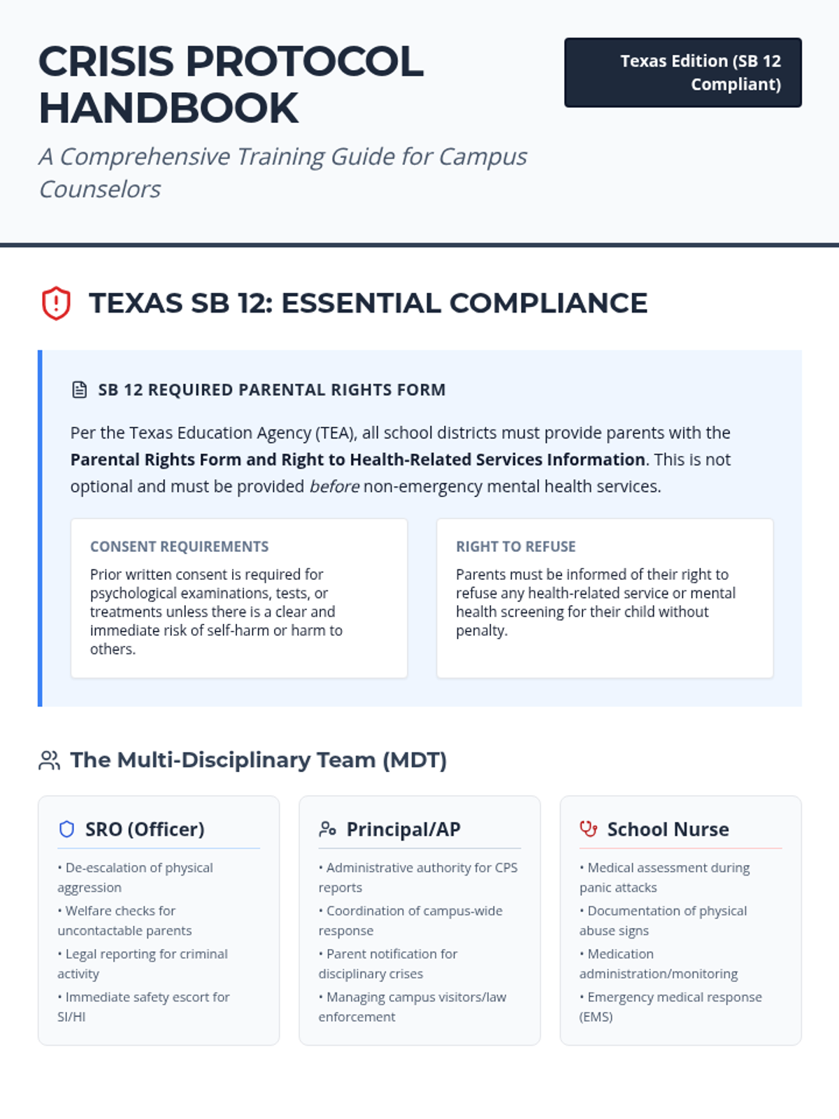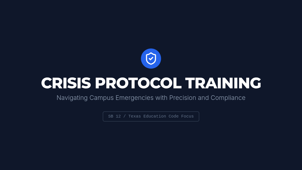 A comprehensive training resource for school counselors on managing campus crises, including scenarios tailored to different grade levels and guidance on collaborating with administration, law enforcement, and medical staff while adhering to Texas SB 12.